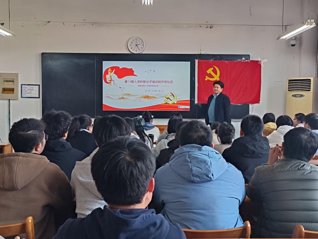 11月22日下午,物理与电气工程学院党总支举行第74期入党积极分子培训班开班式。学院党总支书记袁卫、全体辅导员及64名入党积极分子参加了仪式。开班式由党务秘书陈晨主持。