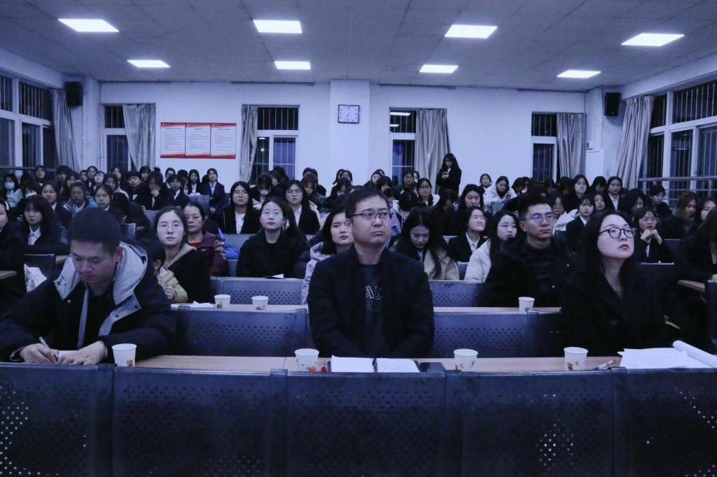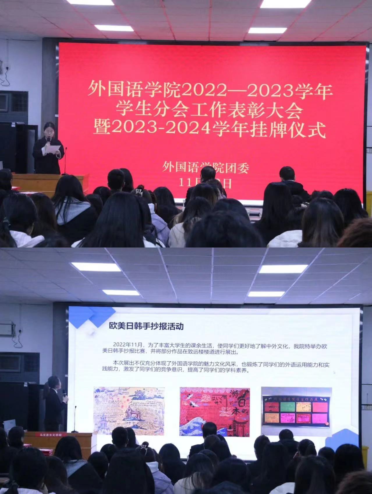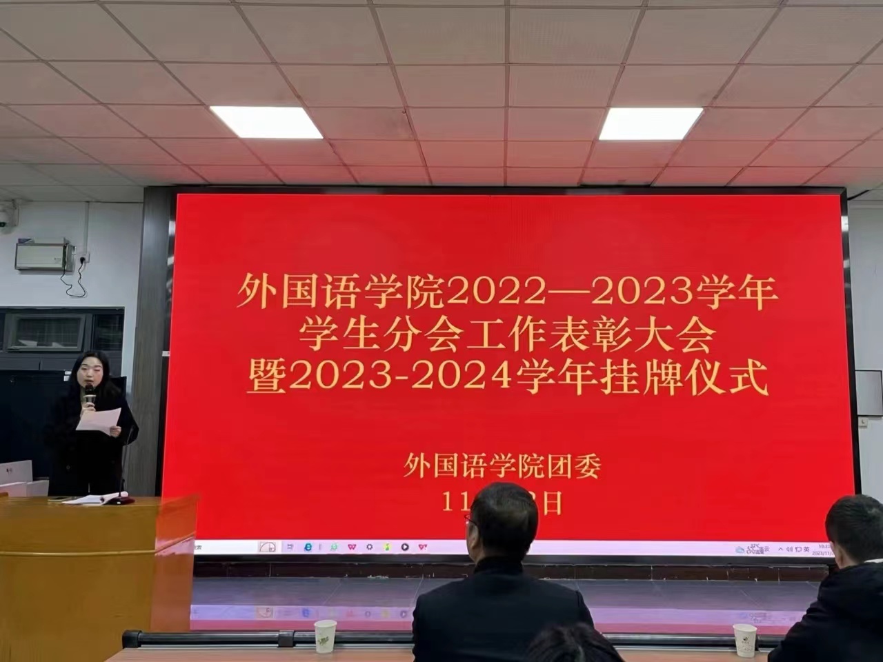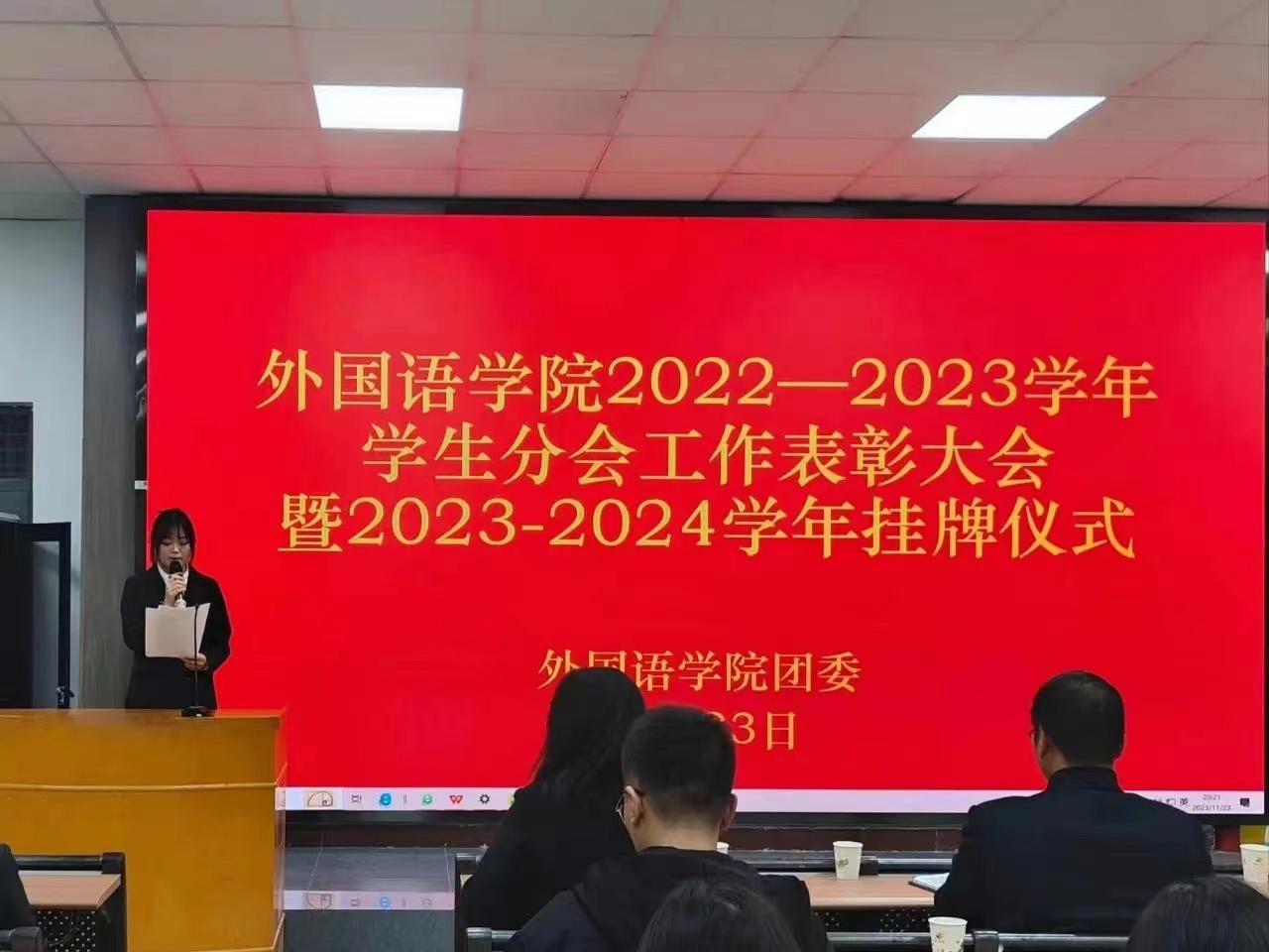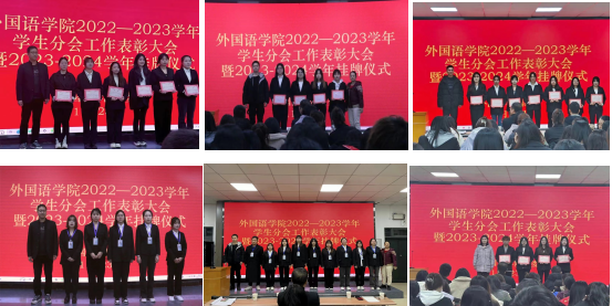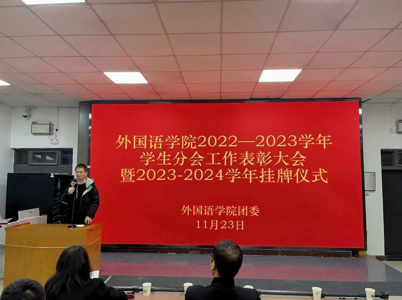 11月23日晚,外国语学院2022—2023学年学生分会工作表彰大会暨2023-2024学年学生干部聘任仪式在1101教室举行。外国语学院党总支副书记、副院长高军强,学工办副主任敬菲菲,全体辅导员,外国语学院学生分会2022-2023届及2023-2024届全体成员参加仪式,会议由团委书记伍萌主持。