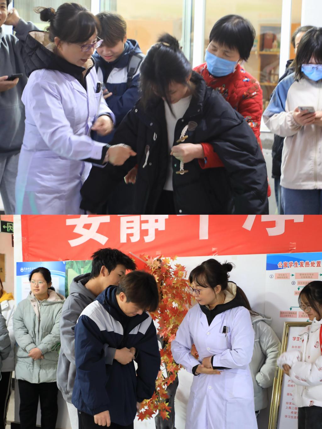 王美丽首先向大家介绍了心肺复苏的重大意义,对心肺复苏分七个步骤进行了讲解。并就按压位置、按压频率、按压和人工呼吸交替次数、救助成功标志等细节问题一一进行演示和强调。王双双现场为师生进行了心肺复苏规范操作演示。辅导员王乐靖、周雨坤,公寓管理员,学生代表在王美丽的指导下现场进行了心肺复苏模拟练习。