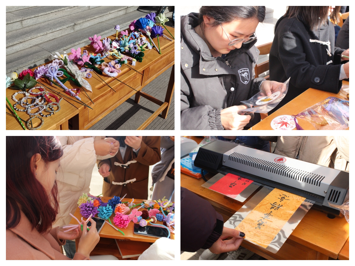 手工制作绒花和泥塑同时开展。五彩缤纷的手工绒花和栩栩如生的泥塑吸引了同学们的目光,他们或领走自己喜欢的作品或参与其中,制作属于自己的作品。