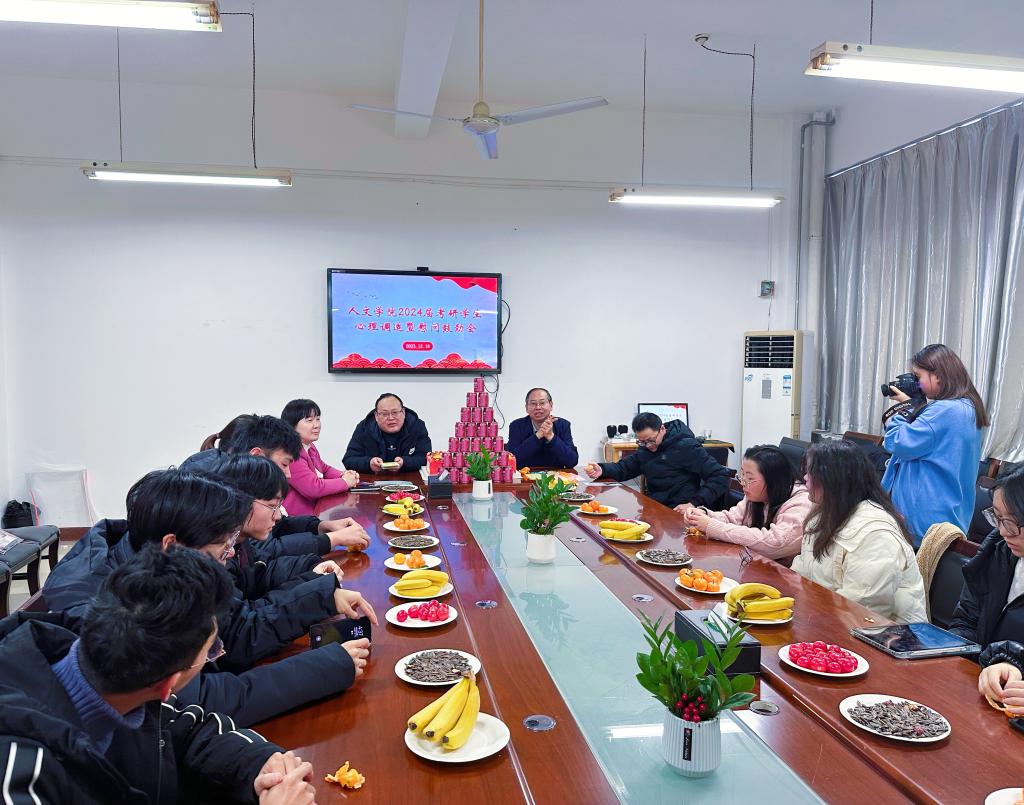 12月18日下午,人文学院召开2024届考研学生心理调适暨慰问鼓劲会。该院领导班子、全体辅导员以及2024届考研学生代表参会。会议由该院党总支副书记、副院长张晶主持。