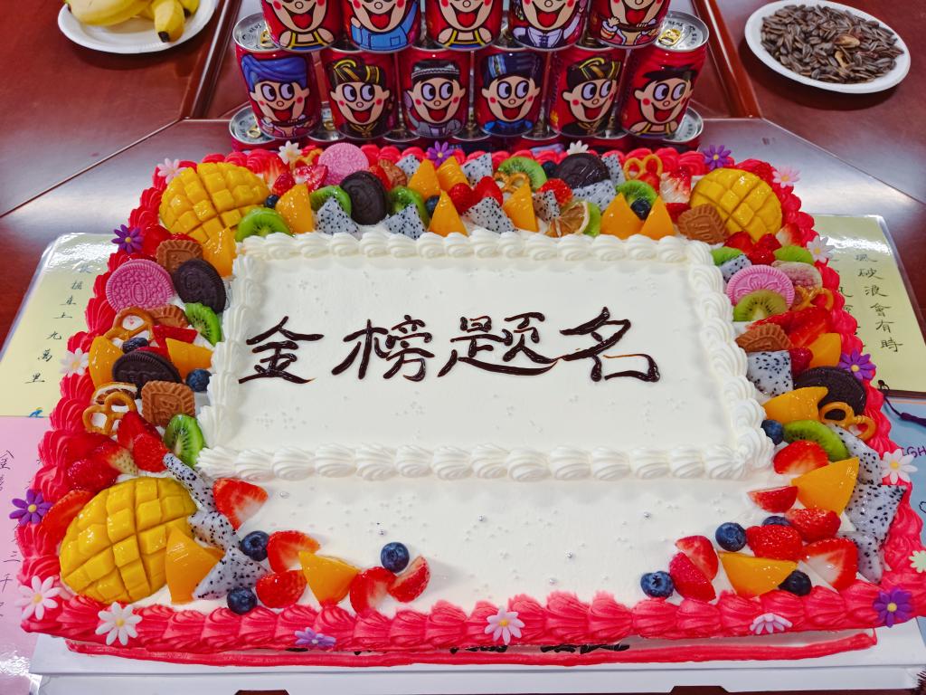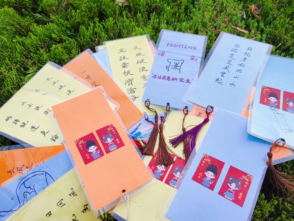 张晶介绍了学院为考研学子精心准备的“上岸”大礼包:老师用繁体字书写,来源于古诗词中的富有人文特色的书签:金鳞岂是池中物,一遇风雨化成龙;东风擢第上瑶京,金榜天门列姓名;一鸣从此始,相望青云端……还有寓意“牛气冲天”的旺仔牛奶,寓意“步步高升”的蛋糕,寓意“越来越棒”的棒棒糖,寓意“好运连连”的巧克力,寓意“大吉大利”的金桔以及考研必备文具。