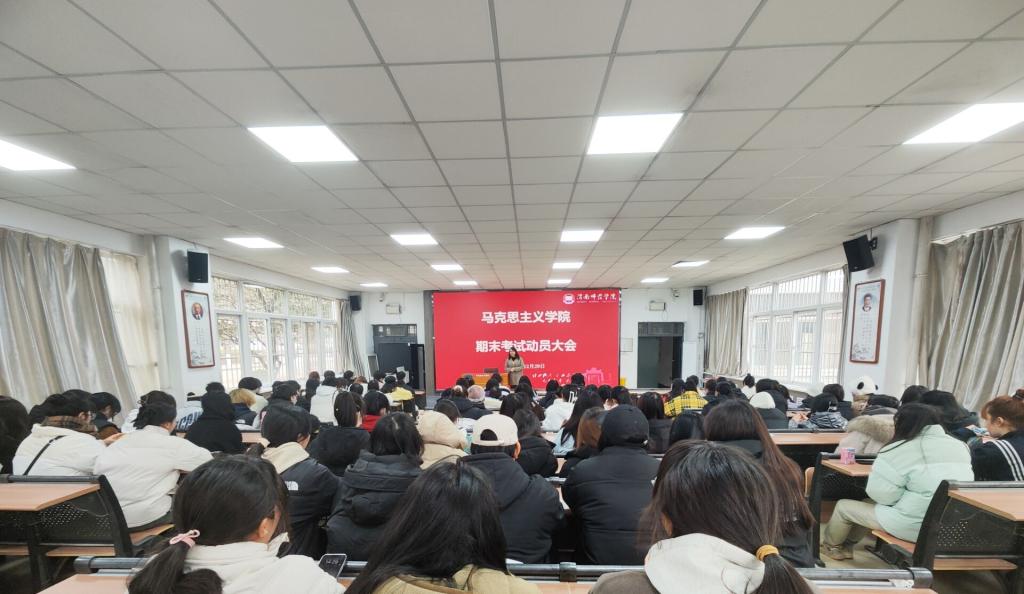 2023年12月29日下午,马克思主义学院处级干部分专业和班级在1101教室召开期末考试动员会,其中党总支书记赵国峰包联2021级学生、院长张萍包联2023级、副院长单剑峰包联2022级学生。