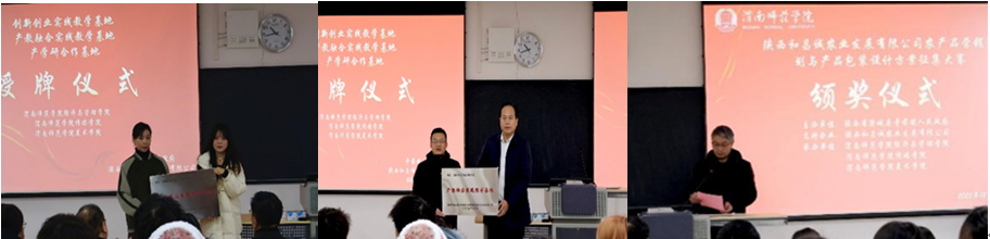 12月29日上午,在富平校区教学楼130教室,经济与管理学院联合传媒学院、美术学院与澄城县寺前镇人民政府、陕西和昌诚农业发展有限公司共同举行的政校企合作授牌仪式及“农产品营销策划和包装设计”大赛颁奖仪式。出席本次活动的有澄城县寺前镇镇长杨荣、陕西和昌诚农业发展有限公司董事长吴亚锋、总经理王艳芳、传媒学院院长曹熙斌、副院长贺宏福、美术学院院长殷晓克、办公室副主任徐宁、经济与管理学院张斌博士和王瑶博士。本次活动由经济与管理学院院长李富荣主持。