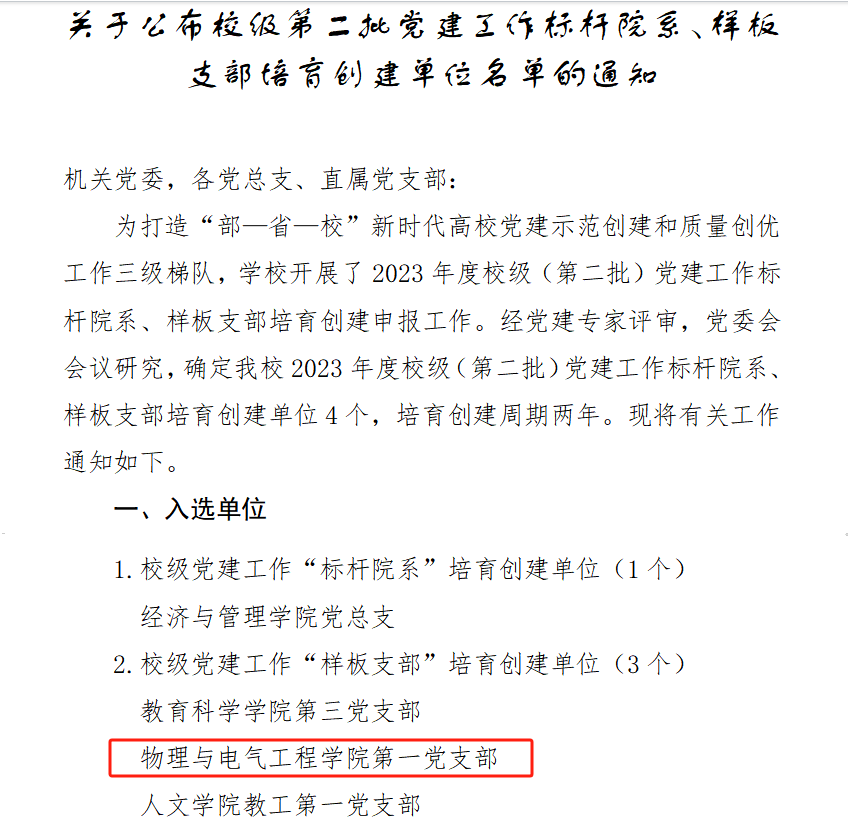 2023年,物理与电气工程学院党总支按照新时代党的建设的总要求,以党的政治建设为统领,以提升基层组织力为重点,不断加强党支部标准化规范化建设,注重师生政治理论学习与实践,凝聚师生合力,共谋学院高质量发展。教工第一党支部按照“党建+”的优势,创新工作方法,培育典型示范,努力建成“支部班子优、党员队伍优、工作业绩优、师生反映优”的模范党支部,充分发挥基层党组织的战斗堡垒作用和共产党员的先锋模范作用,紧紧围绕立德树人根本任务,打造标准化党支部,发挥党建引领的示范作用。学院党建品牌栏目“物堂师风”选树教书育人典范,弘扬师者崇高风范,展示专业教师风采,助推教育教学提质增效。学生思政教育栏目“党员先锋论坛”“铸魂增智成长营”以朋辈示范、领学导航等形式深入开展学生思想政治教育、教育引导学生坚定理想信念,厚植爱国情怀,增强“四个自信”,矢志勤学报国。