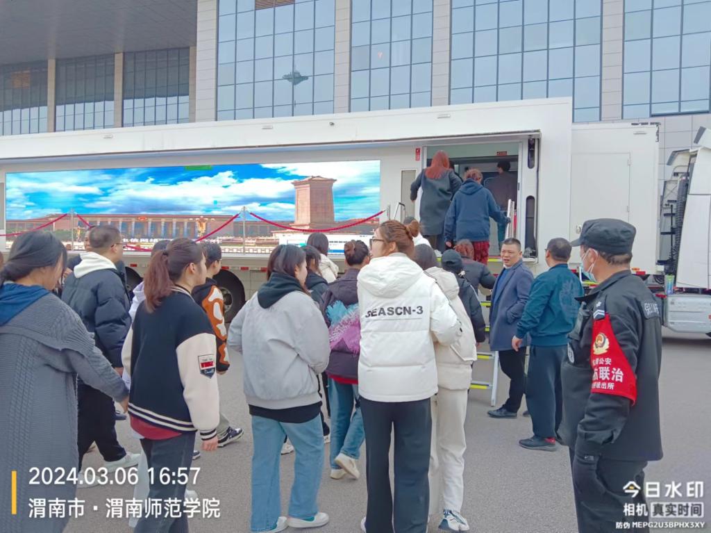 3月6日下午,学校保卫处联合渭南市公安局、陕西省移动通信公司在朝阳校区云帆体育馆前开展了反电诈宣传体验车进校园活动。渭南市公安局临渭分局刑侦大队大队长杨剑鸣、站南派出所民警闵昌及学校师生代表300余人参与活动。