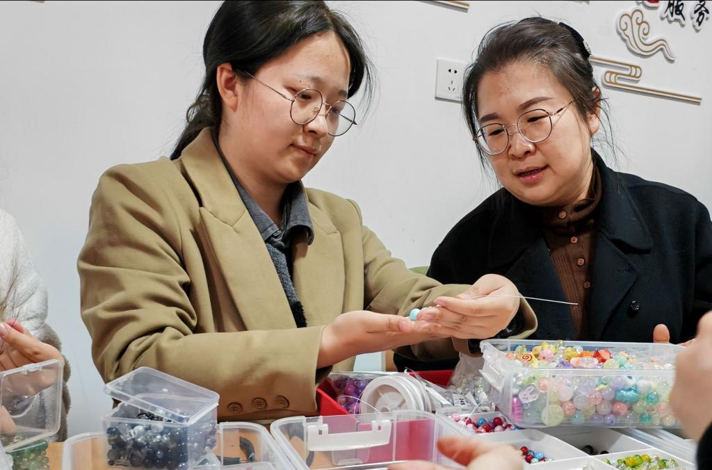 活动现场气氛热烈,创意层出不穷。手中线灵活游走在指尖,大家在美丽的串珠中体验美、感受美、创造美,鎏金的光芒与晶莹的珠链交织,巧妙的串珠充满了诗意与浪漫。在作品展示时刻,她们纷纷举起自己的巧思作品,每个人脸上都洋溢着灿烂的笑容,美好的记忆定格在这一刻。