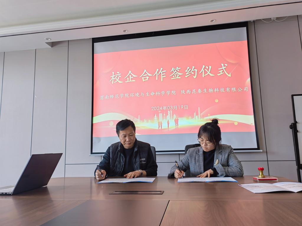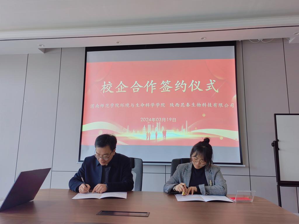 刘龙飞代表环境与生命科学学院与陕西昆秦生物科技公司签订大学生就业基地协议,蒋缠文与陕西昆秦生物科技公司签订教学实践基地协议。