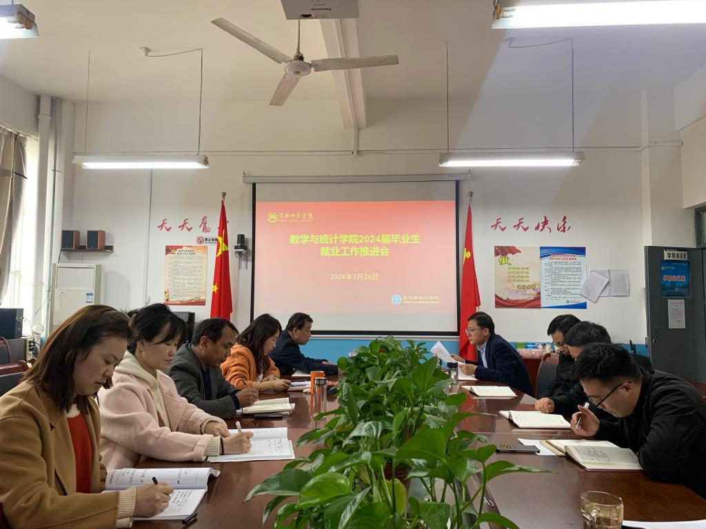 3月26日下午,数学与统计学院在2318会议室召开2024届毕业生就业工作推进会,学院党政领导及全体行政人员参会,会议由党总支副书记张菊梅主持。