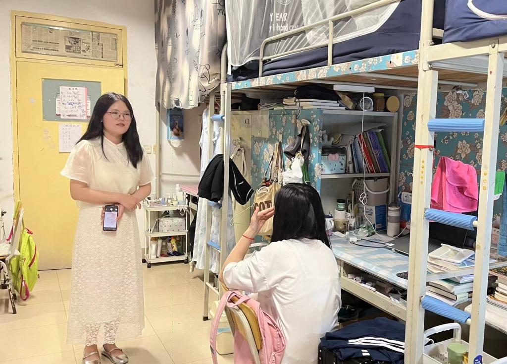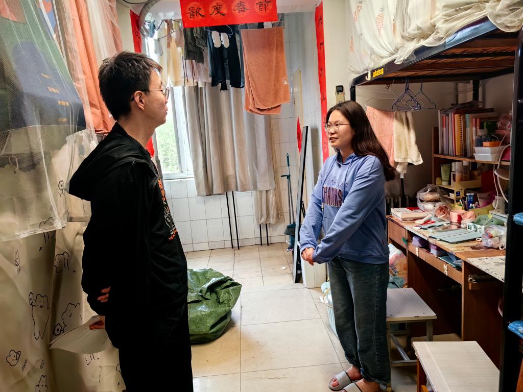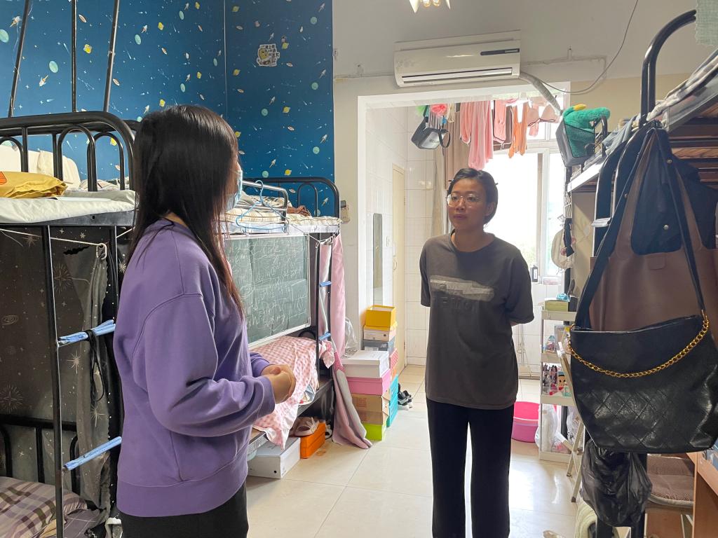 在寝室中,辅导员与同学们亲切交谈,仔细询问同学们的学习生活情况,鼓励同学们积极参加丰富多彩的校园活动和各项体育锻炼。