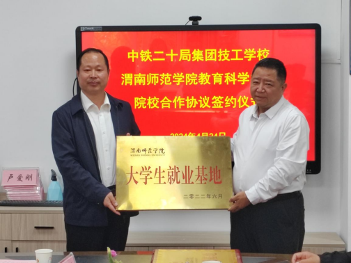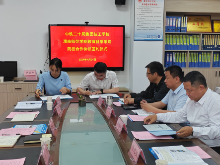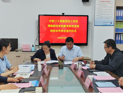 4月24日下午,教育科学学院与中铁二十局集团技工学校在best365朝阳校区知新楼2218举行院校合作协议签约仪式。best365中国官方网站党委副书记汪勇,中铁二十局集团技工学校党总支书记、校长杨鹏演出席签约仪式,教育科学学院党总支书记李武军、副院长马雅菊、学工办副主任赵丹卉,中铁二十局集团技工学校党总支副书记陈选强、副校长牛壮等一行6人及我院部分毕业生参加签约仪式。会议由教育科学学院党总支副书记马雷蕾主持。