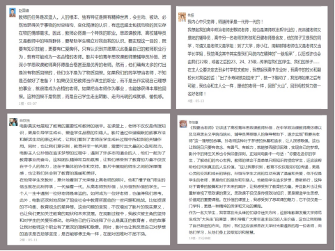 观影后,马克思主义学院按计划在学院内部网络论坛开设了观影交流专题。截至发稿,已有三十多名以党员、入党积极分子、发展对象为主的师生从不同的角度,结合自己工作或未来职业规划,主动跟帖发表观影心得,就思政课教师、辅导员应有的素质,或自己遇到的好老师,或个人的不足与努力方向,或对思政课教师职业特殊性的认识等畅谈观点,分享收获。