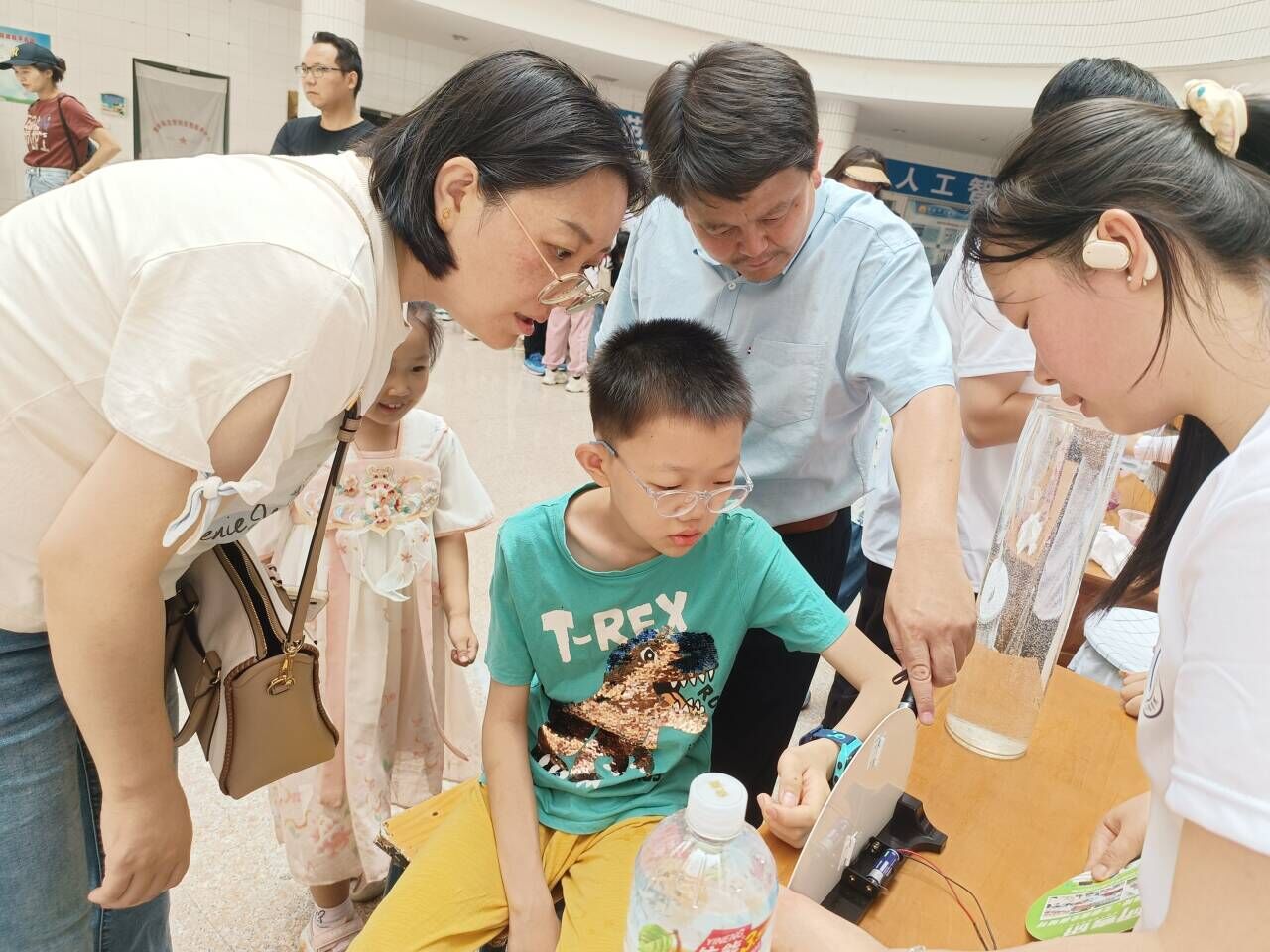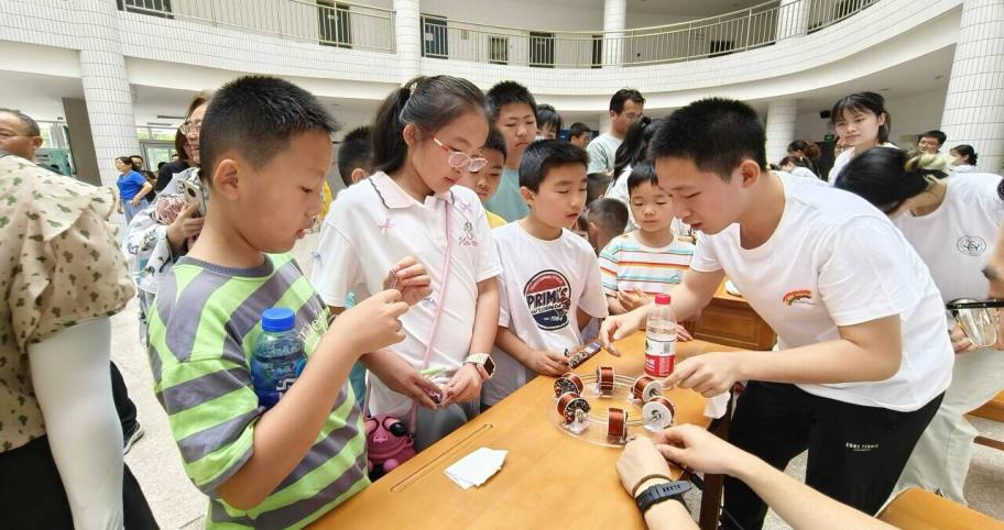 本次科学实验秀共展出了28项实验,有涉及电磁现象的“磁力炮”“隔空取电”“静电章鱼”“静电除尘”“磁力火车”,有涉及力学现象的“随风而动的气球”“无动力喷泉”“平衡鸟”,有涉及光学现象的“被困住的光”“消失的硬币”,有涉及热学现象的“薪火相传”“烟雾瀑布”“冷热大战”等。参加本次活动的小朋友和大学生志愿者互动交流,现场体验各种神奇的物理现象。
