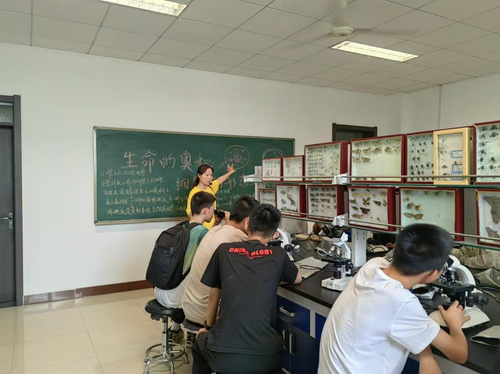 主讲教师李亚琳教授、史秀超博士为前来参观的小学高年级以及初中学生讲解细胞的结构与功能,现场指导学生观察组织切片以及植物花粉、叶片的结构,让学生沉浸式体验临时装片制作过程,并观察自己的口腔上皮细胞结构。此外,指导教师还带领学生参观了人体结构模型及动植物标本。