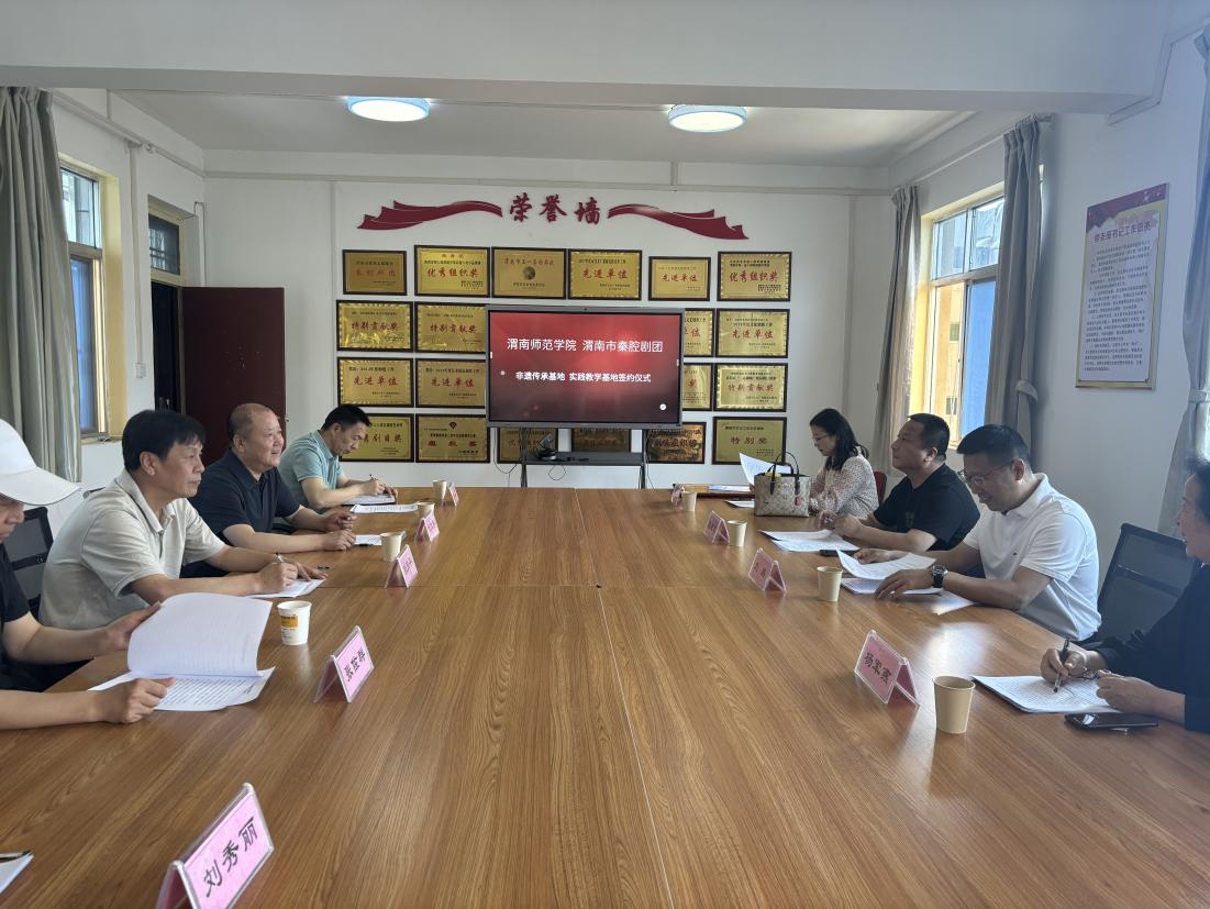 5月31日上午,音乐学院院长刘鹏、副院长逯克刚,秦东非物质文化遗产科普基地主任杨军燕教授,博士教师马茜一行赴渭南市秦腔剧团参观调研,并与渭南市秦腔剧团签订非遗传承、实践教学基地共建协议。渭南市秦腔剧团团长兼党支部书记代九奎主持了签约授牌仪式,双方就深化高校与地方专业院团合作,推进秦东地方戏曲艺术传承,共同开展非遗项目研究等议题进行了热烈的讨论。参加此次活动的还有渭南市演艺有限公司总经理张天平,渭南市秦腔剧团艺术总监张佐群,办公室主任李康,国家一级编剧路树军先生,国家一级演员刘秀丽等人。