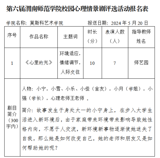 5月20日,best365中国官方网站大学生心理健康教育指导中心在厚德楼团辅室举办第六届校园心理情景剧大赛初赛。莫斯科艺术学院积极组织学生参与,选拔优秀剧本,引导学生从身边选取素材,最终推荐2022级学前教育专业222班拓亚男撰写排演的作品《心里的光》参与学校评选。