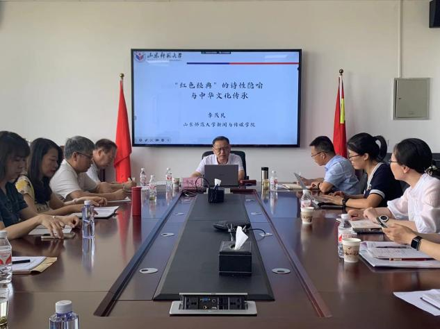 6月14日上午,传媒学院在积学楼5406会议室举办学术讲座,山东师范大学三级教授、博士生导师李茂民为学院教师带来题为《“红色经典”的诗性隐喻与中华文化传承》的学术讲座,讲座由院长曹熙斌主持,党总支书记田康顺、副院长侯君奕、副院长贺宏福及各专业教师参加讲座活动。