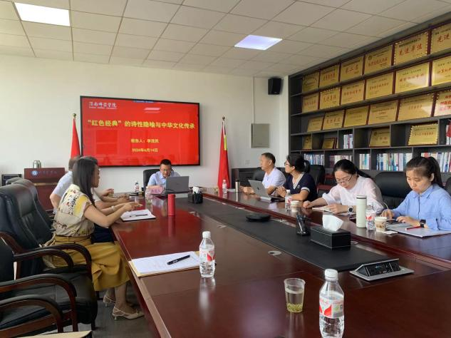 讲座伊始,曹熙斌对李茂民教授的学术造诣及重要成果作简要介绍。李茂民教授由阐述“红色经典”研究的既有范式如“重写文学史”“再解读”与“文化研究”等存在的问题和缺陷破题,引入“红色经典”跨文本研究这一核心议题。在对《白毛女》《林海雪原》《红旗谱》《青春之歌》《红岩》等经典作品的文学、戏剧、电影、电视剧文本进行跨文本阐释的过程中,提炼出“红色经典”的诗性隐喻。李教授认为,对于人民群众来说,“红色经典”之所以具有震撼心灵的艺术魅力,正是源于作品中独特的太阳/光明、中心/边缘的诗性隐喻。这种诗性隐喻不仅是一种修辞手法,也是一种文本建构要素,它以含蓄而又形象的方式揭示了中国革命必将走向胜利的历史规律。借助这种源自中华民族集体无意识的诗性隐喻,“红色经典”接通了中华民族文化的源头活水,讲好了中国红色革命故事,从而传承了红色基因,赓续了红色血脉。李茂民教授与各位老师就红色文化与传媒艺术类人才培养、教师科研能力提升与项目申报等进行了深入交流。