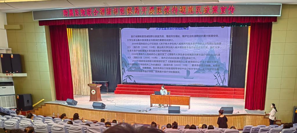 6月19日下午附属医院特邀请渭南市医疗保障中心、临渭区医疗保障中心的医保政策宣讲团队专家走进学校,在陶然楼演艺厅就教职工和大学生医疗保险2024年新政策进行了“医保宣传面对面政策解读零距离”的宣讲活动。