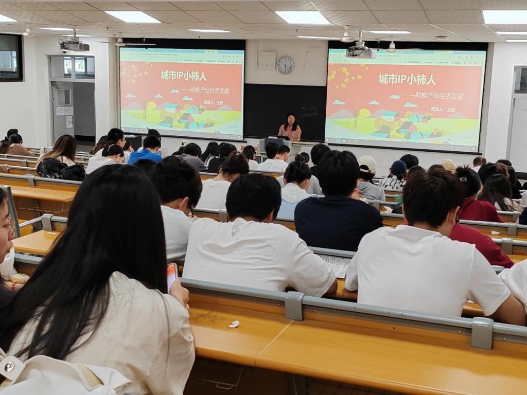 小柿人文化传媒有限公司负责人王默以《城市IP小柿人——助推产业经济发展》为题从项目背景、市场分析、营销计划、产品介绍、团队介绍、公司荣誉等方面介绍了公司发展情况。她从自身经验出发为同学们提出观者思维、顺势而为、行动力一定要强三点建议,并鼓励同学们不怕犯错,大胆去做。
