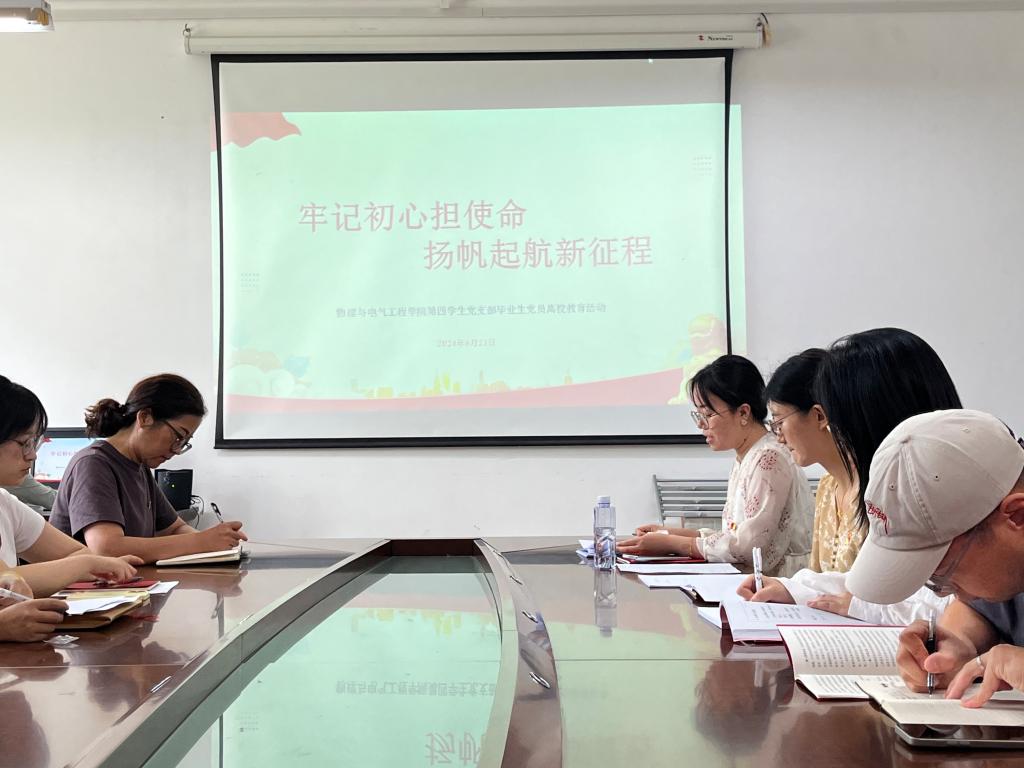 6月21日下午,物理与电气工程学院第四学生党支部开展了“牢记初心担使命 扬帆起航新征程”毕业生党员离校教育活动。学院党总支副书记权轻舟、毕业班辅导员及全体毕业生党员出席,活动由支部书记张静雯主持。