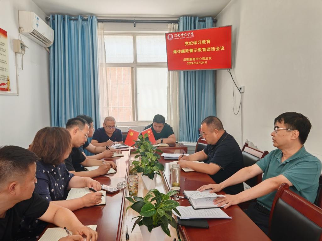 6月24日,后勤服务中心党总支召开党纪学习教育集体廉政警示教育谈话会,后勤服务中心党总支书记席景奇主持会议并进行集体廉政提醒谈话,中心班子成员、各科室负责人参加会议。