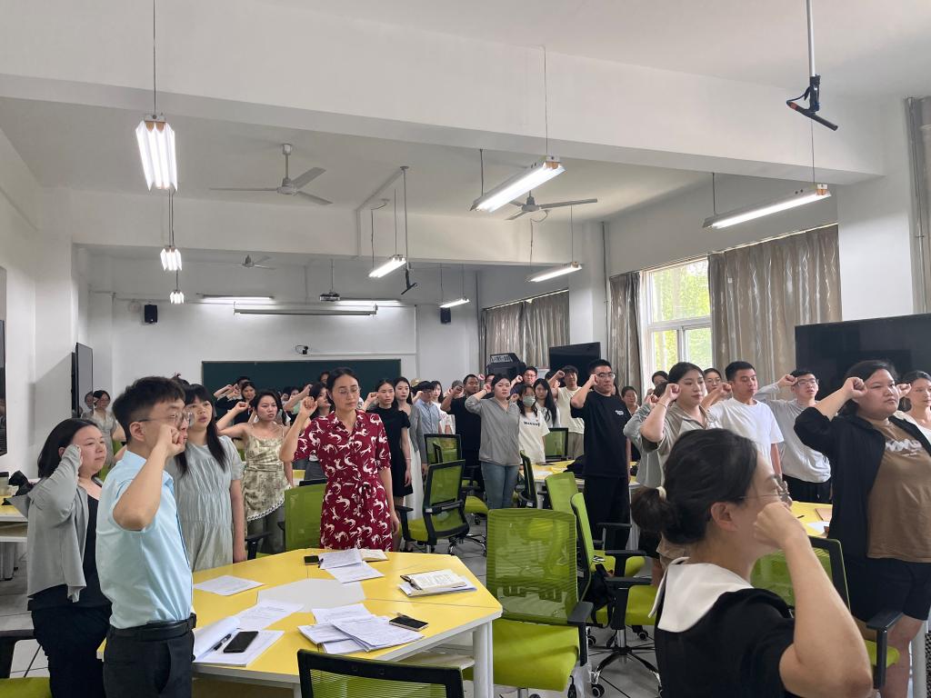 崔娟带领全体党员重温入党誓词。面对鲜红的党旗,同志们庄严地举起右拳,在字字铿锵中重温入党誓词,回顾初心使命。