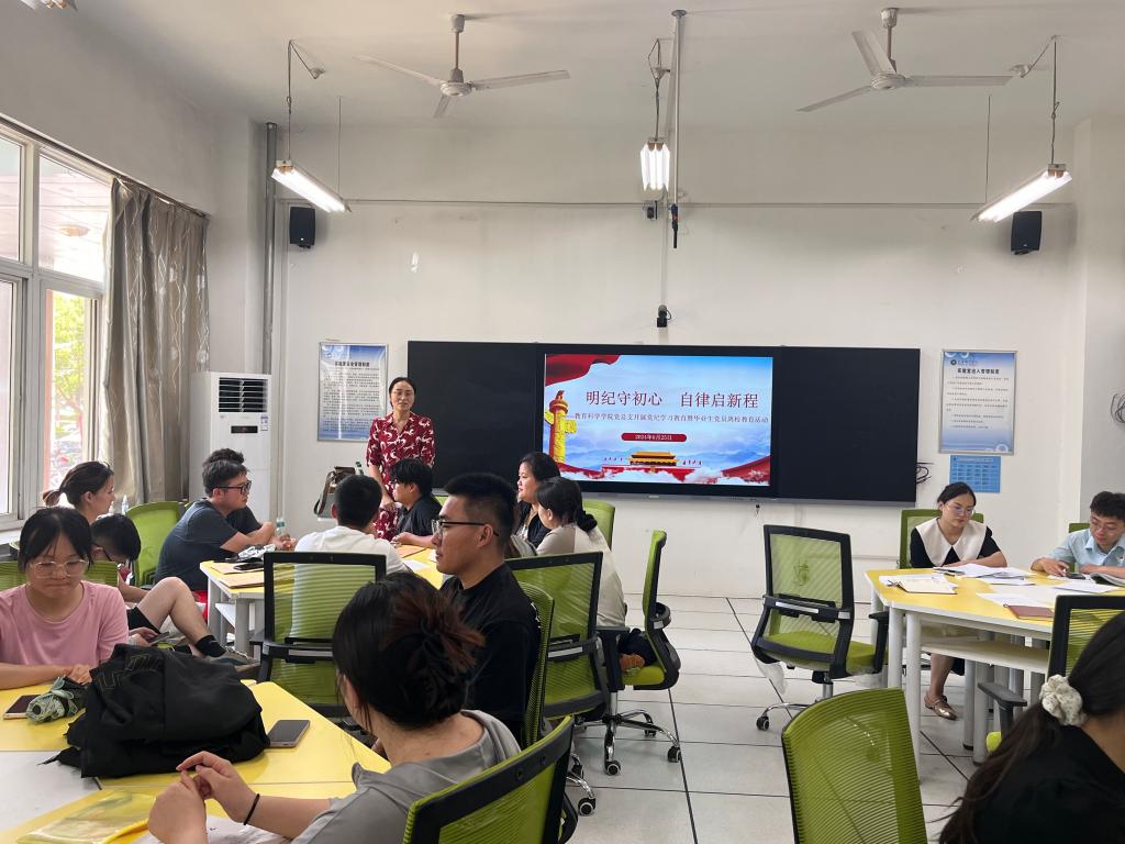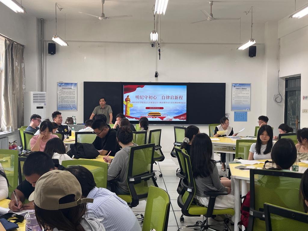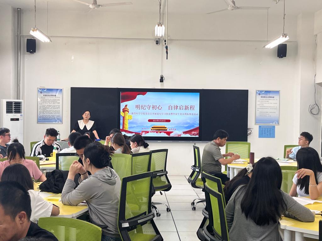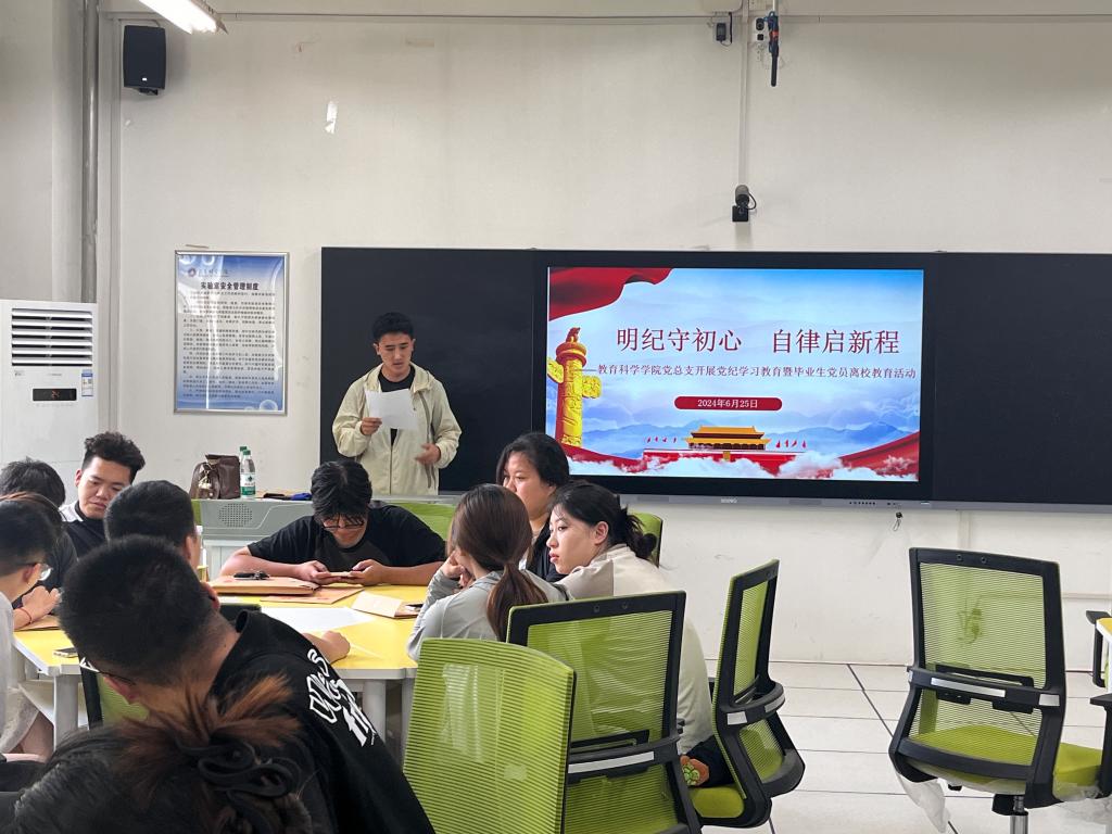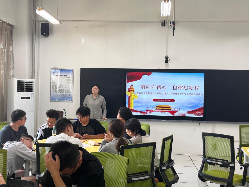 6月25日,教育科学学院党总支以“明纪守初心 自律启新程”为主题开展党纪学习教育暨毕业生党员离校教育活动。学院党总支书记李武军、副书记马雷蕾、学工办副主任赵丹卉、团委书记谭宗英、毕业班辅导员及2024届全体毕业生党员出席活动。活动由党务秘书崔娟主持。
