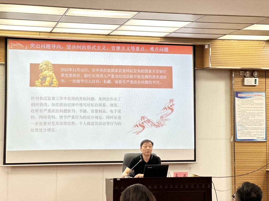 共上一堂纪律党课。孟波同志以“新修订的《中国共产党纪律处分条例》有哪些突出特点”为主题,围绕“全面贯彻党的二十大精神、突出问题导向、坚持与时俱进”三个方面进行了深入细致的讲解,让党员们深刻认识到严明党的纪律对于维护党的团结统一、推动党的事业发展的重要性。要求全体党员深入学习新《条例》,自觉用《条例》规范自己的行为,充分激发干事创业的内生动力,使党纪学习教育成为推动学院中心工作的有效举措,为学院高质量发展保驾护航。(通讯员 高梦涵 审核人 孟波)