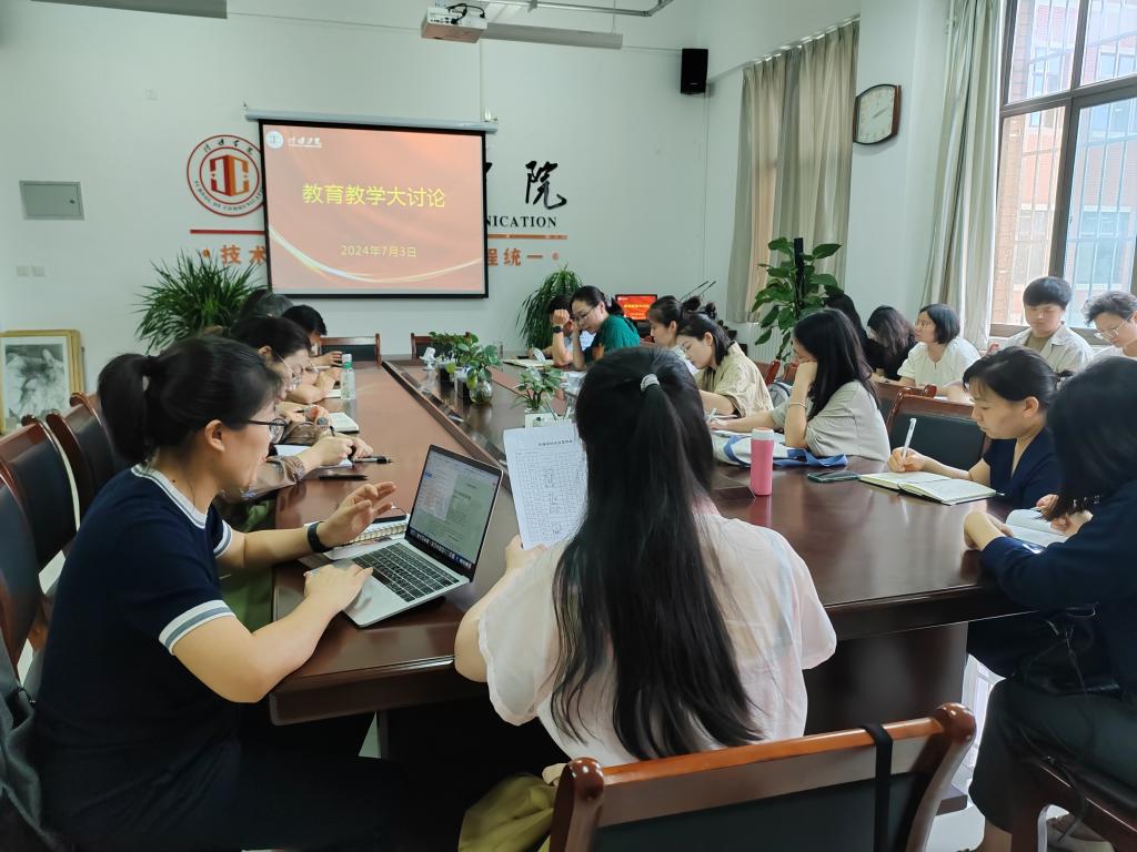 7月3日,传媒学院开展教育教学大讨论活动,全体教职工参会,会议由院长曹熙斌主持。与会教师就本学期教学工作进行交流,重点围绕教学管理、人才培养、教学成果、学科建设、课程思政等方面提出意见建议。