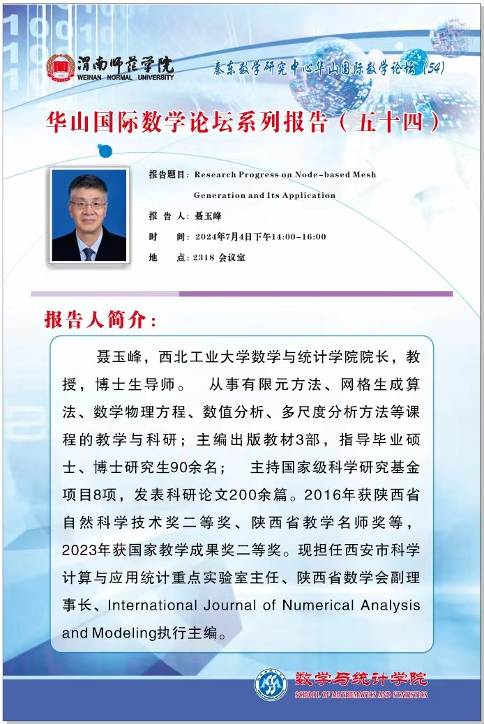7月4日下午,数学与统计学院特邀西北工业大学数学与统计学院院长、博士生导师聂玉峰教授为学院师生作题为《Research Progress on Node- based MeshGeneration and Its Application》精彩报告,报告会由院长陈斌主持。