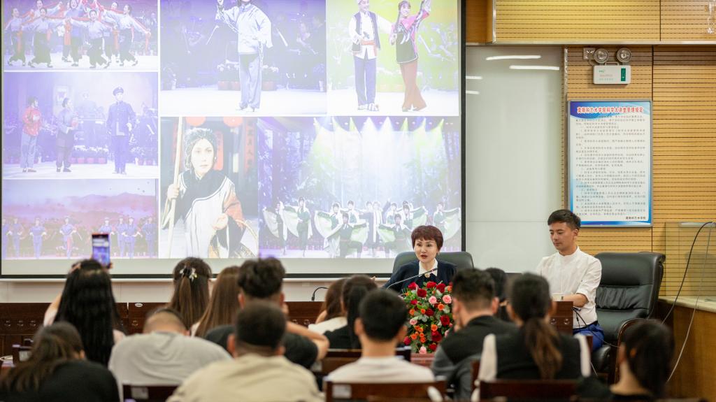 李梅结合自身四十多年的从艺经历,为学员们阐述了戏曲演员如何巧妙地借助戏曲程式塑造出活灵活现的舞台人物形象。讲座现场学员们精神状态饱满,认真聆听,积极互动。李梅老师现场还展示了碗碗腔《骄杨之恋》的精彩片段,赢得在场师生的阵阵掌声。