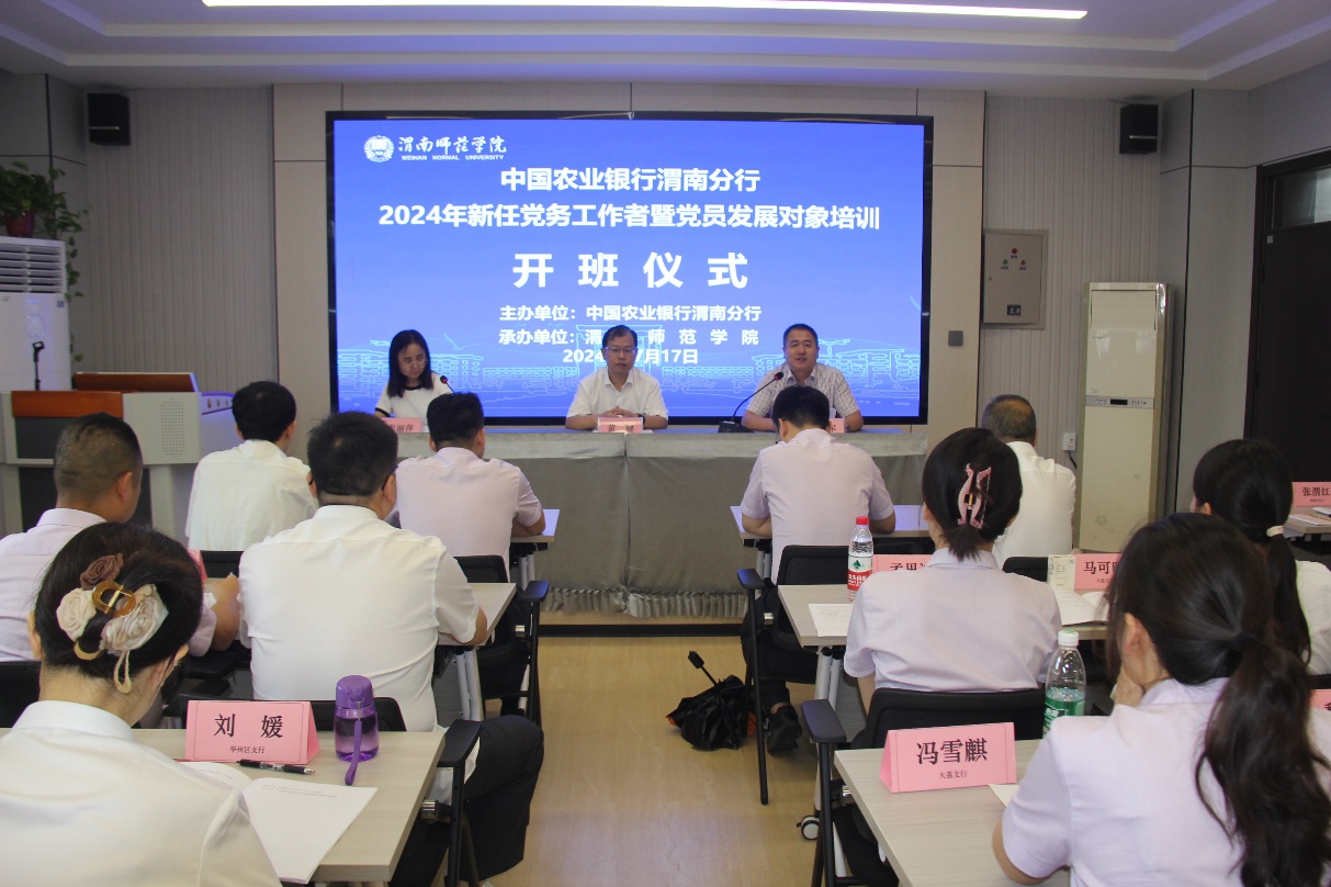 中国农业银行渭南分行组织部部长黄健,继续教育学院副院长苟鹏军,培训班项目班主任、项目秘书以及60余名参训学员参加了开班仪式。开班仪式由继续教育学院副院长宋丽萍主持。