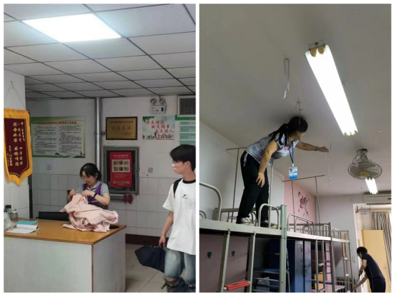 学生公寓宿舍管理员们,她们认真地打扫着每一间毕业生宿舍,维修工对毕业生宿舍内设施进行维修,为学生们营造一个温馨整洁的居住环境。宿管员为假期留校学生缝补衣物,她们的关怀如同夏日里的清风,吹拂着每一个学子的心田。