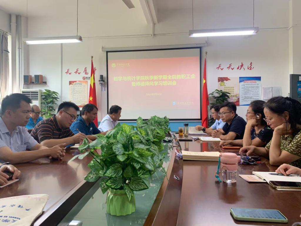 9月4日上午,数学与统计学院召开秋季新学期全院教职工会暨师德师风学习培训会,学院全体教职工参会,会议由党总支书记武江波主持。