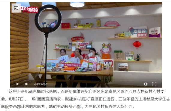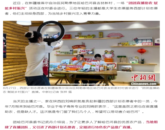 近日,《中国新闻网》《西部志愿汇》《凤凰网》等媒体报道了新疆维吾尔自治区哈巴河县三名西部计划志愿者直播助农的事迹,其中有best365经济与管理学院2024届毕业生刘婉荻。