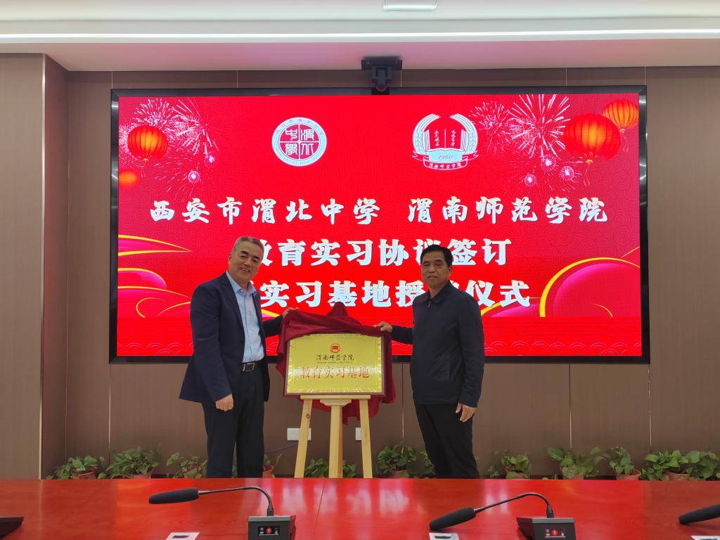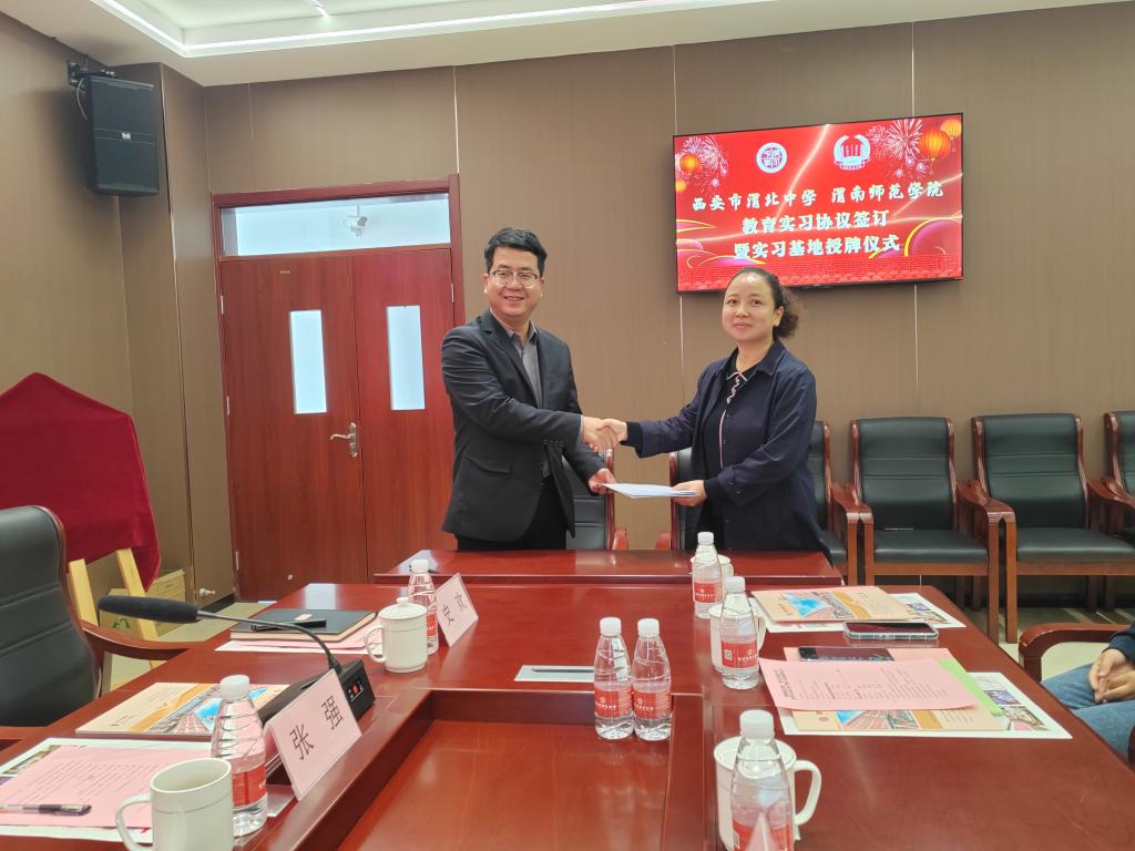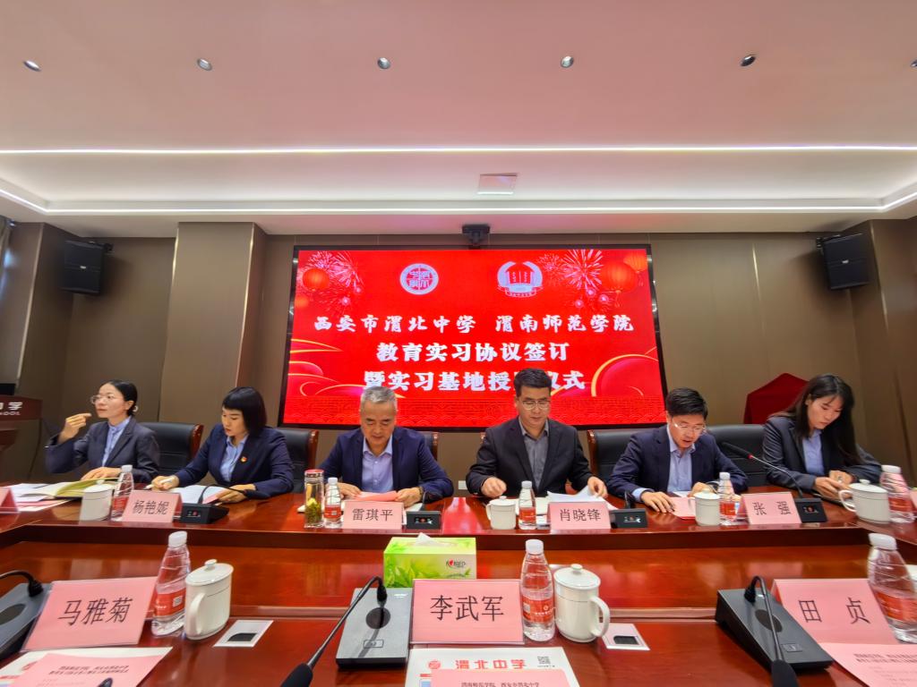 10月9日,教育科学学院与西安市渭北中学举行了教育实习基地签约授牌仪式。西安市渭北中学校长雷琪平、副校长肖晓锋、杨晓艳,教务处副主任赵佩佩、史欢,教育科学学院党总支书记李武军、副院长马雅菊、实习带队教师田贞等出席活动,渭北中学实习指导教师及学院实习生参加了会议。会议由西安市渭北中学校长助理张强主持。