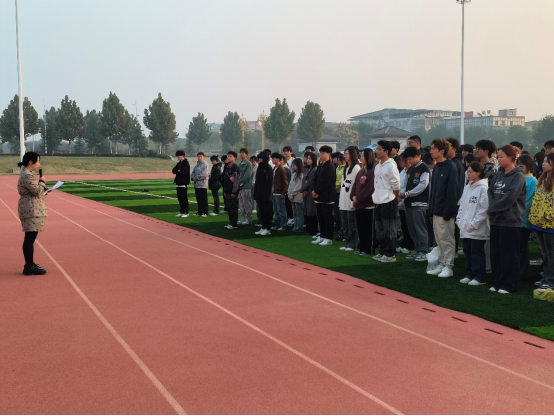 曹熙斌作动员讲话,他引用毛主席《体育之研究》中“野蛮其体魄,文明其精神”的口号,生动阐释锻炼身体、增强体质的重要性。希望同学们继续发扬军训期间优良传统,培养坚韧不拔的意志,增强责任感与使命感,发扬团队精神,认真落实“两早一晚”的要求,养成积极、健康、向上的学习和生活习惯,做一名德智体美劳全面发展的合格大学生。