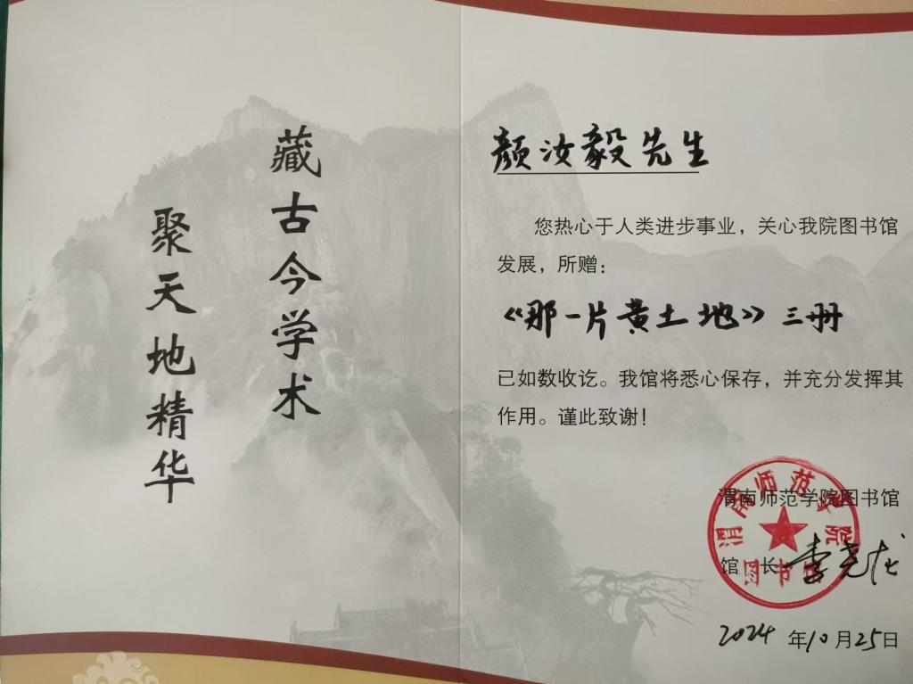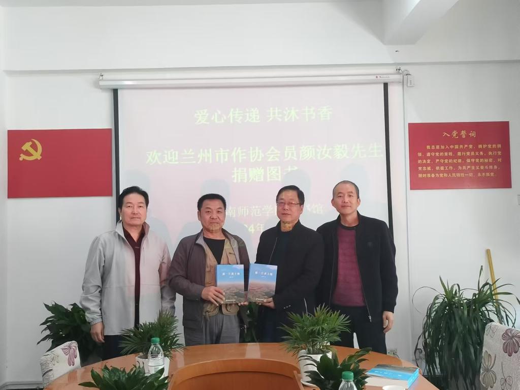 10月25日上午,兰州市作协会员颜汝毅先生向学校图书馆捐赠《那一片黄土地》3册,图书馆已如数收讫,经图书编目后将和读者见面,图书馆敬予颜汝毅先生图书捐赠证。