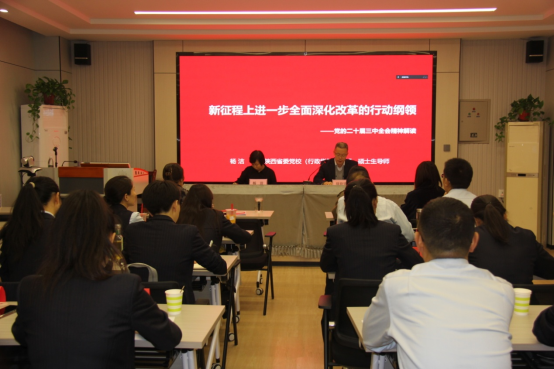 10月25日,继续教育学院特邀中共陕西省委党校(陕西行政学院)杨洁教授作题为《新征程上进一步全面深化改革的行动纲领——党的二十届三中全会精神解读》的精彩报告。校党委委员、副校长王菊霞巡听指导,学院党员干部及建行渭南分行40余党务工作者聆听了报告会。理论学习报告会由直属党支部书记周德锋主持。