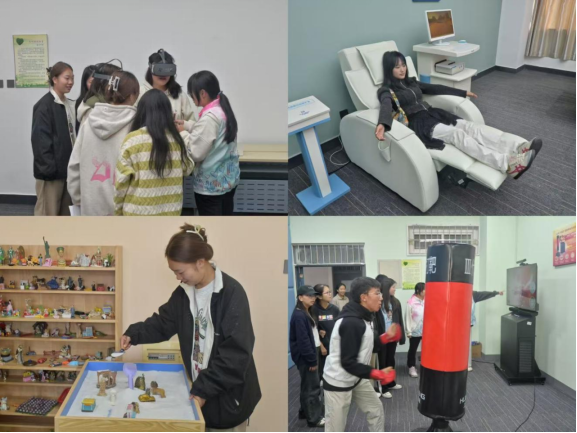 在活动中,同学们在心理健康中心工作人员的带领下,参观了心理减压室、沙盘治疗室、多功能放松室等多个功能区。在心理减压室,同学们尝试如何通过减压设备缓解压力和焦虑情绪;在沙盘治疗室,学习沙盘疗法的基本原理和操作方法,体验了沙盘创作释放内心压力;在多功能放松室,在心理健康中心工作人员的指导下,通过一些简单的心理游戏和放松练习,切身体会到了情绪管理和压力释放的重要性,通过讲解与互动环节,进一步加深了对心理健康的理解。