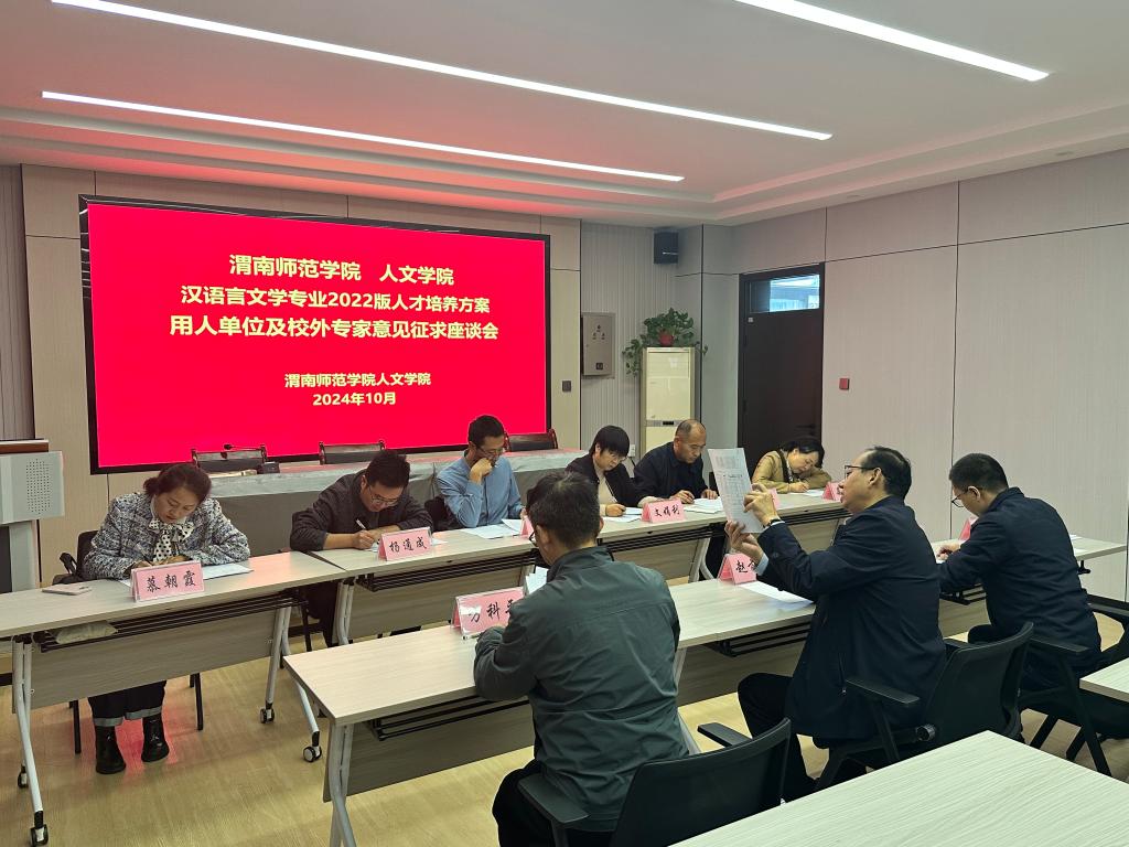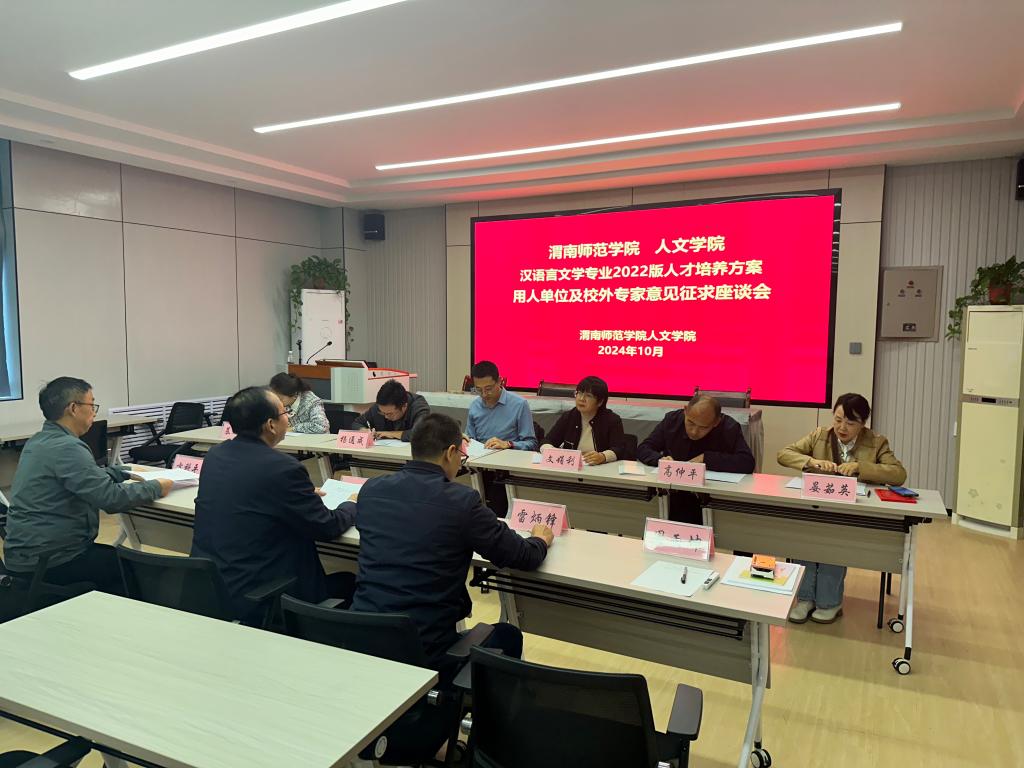 10月29日下午,人文学院在继续教育学院第三培训室召开汉语言文学专业2022版人才培养方案用人单位及校外专家意见征求座谈会,特邀韩城市桑树坪学校文娟利、延安市志丹县龙岗实验中学丁字红、横山区石湾中学高仲平、汉中宁强青木川九年制初中杨通成、安康市汉阴县实验中学晏茹英、绥德县一中慕朝霞6位中小学校长、副校长、教务主任交流座谈。人文学院院长赵前明、副院长雷炳锋、中文系主任方科平参加座谈会。