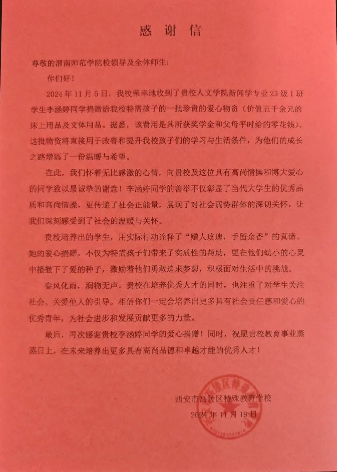据悉,李涵婷用奖学金和零花钱为高陵区特殊教育学校捐助了68套床上用品和一批学习用品。(通讯员 文/王乐靖 图/王雪 审核人 张晶)