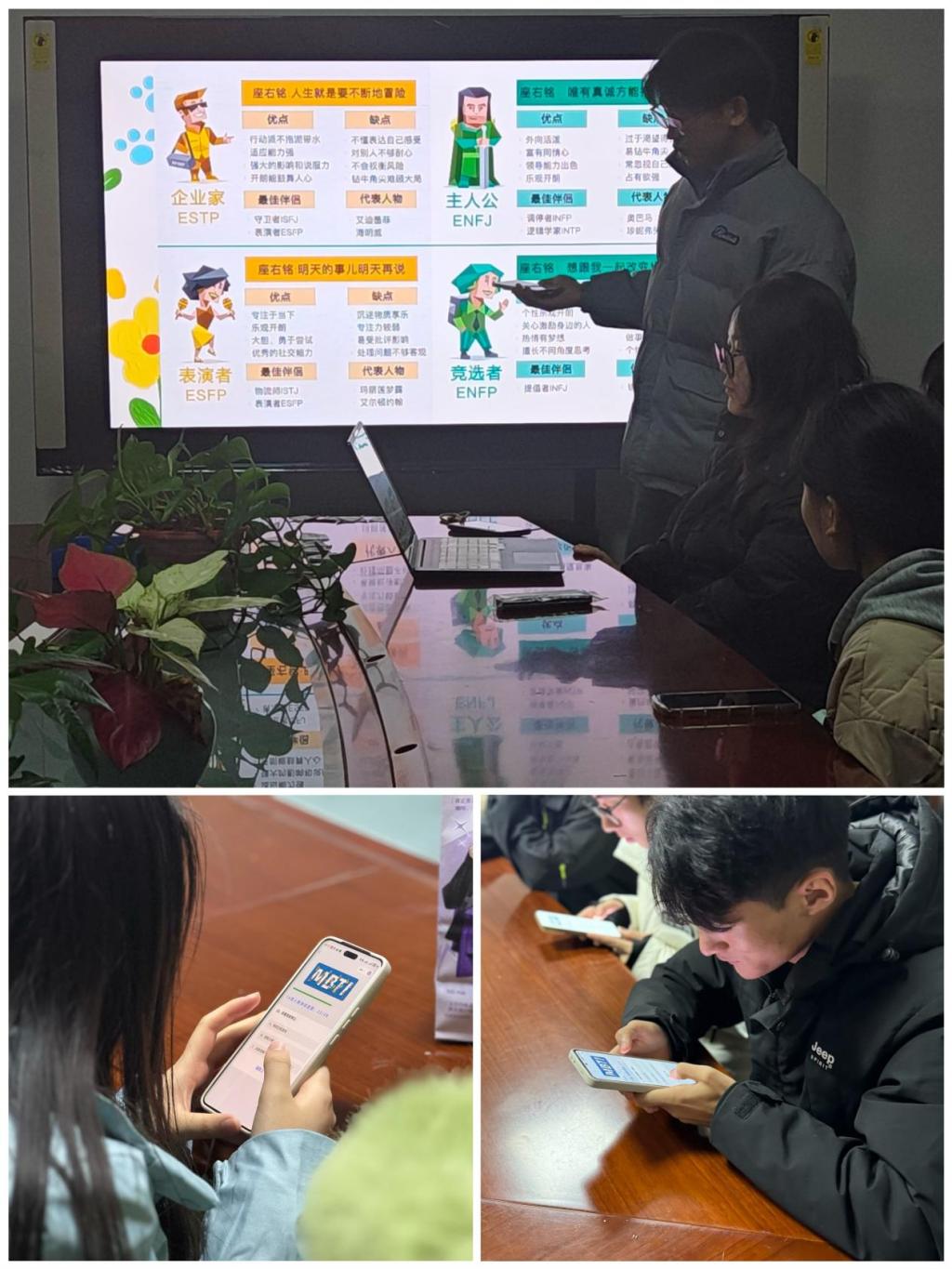 在MBTI职业性格测试环节,同学们认真回答问卷中的每一个问题,深入反思自己的行为方式、决策风格以及与人交往的模式。通过测试,大家学会了如何更好地认知自我,明确职业航向。