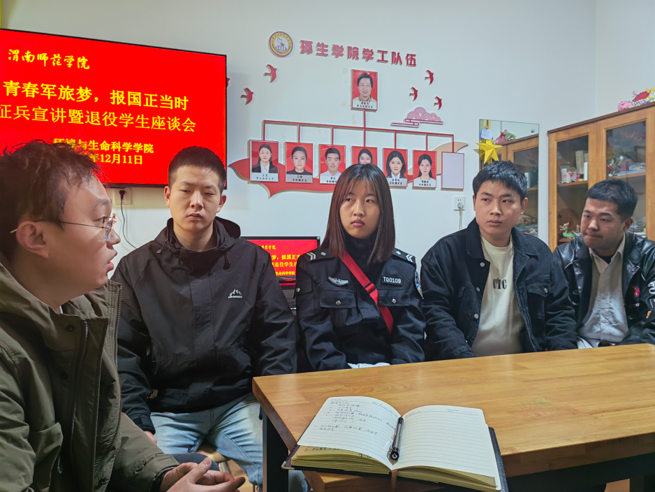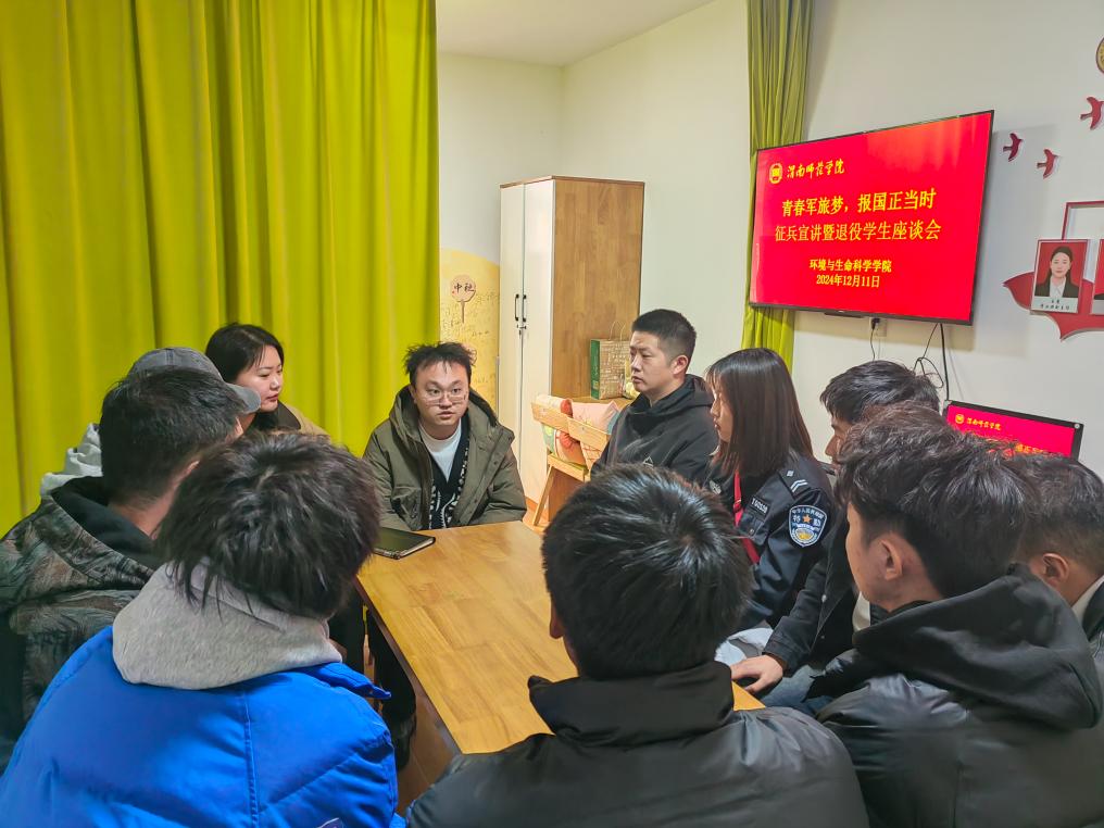 12月11日下午,环境与生命科学学院开展“青春军旅梦,报国正当时” 征兵宣讲暨退役学生座谈会。座谈会特邀学生工作部国防教育科科长刁中堃担任主讲,学院学工办副主任王慧、辅导员代表、退役大学生士兵以及有参军意愿的同学共同参加了此次座谈会。