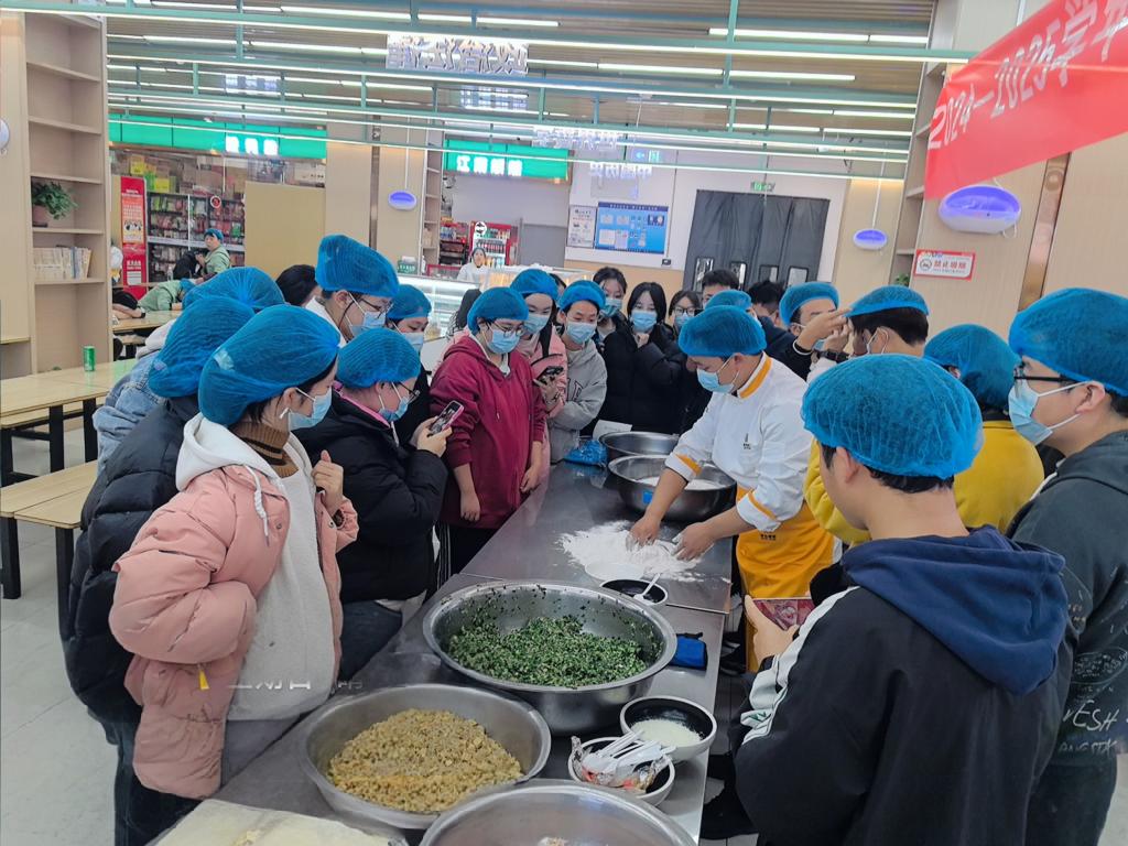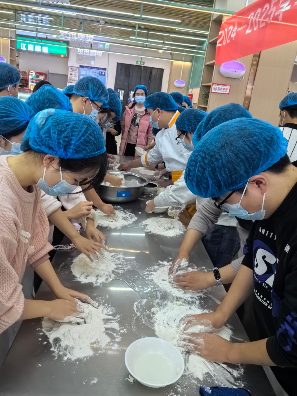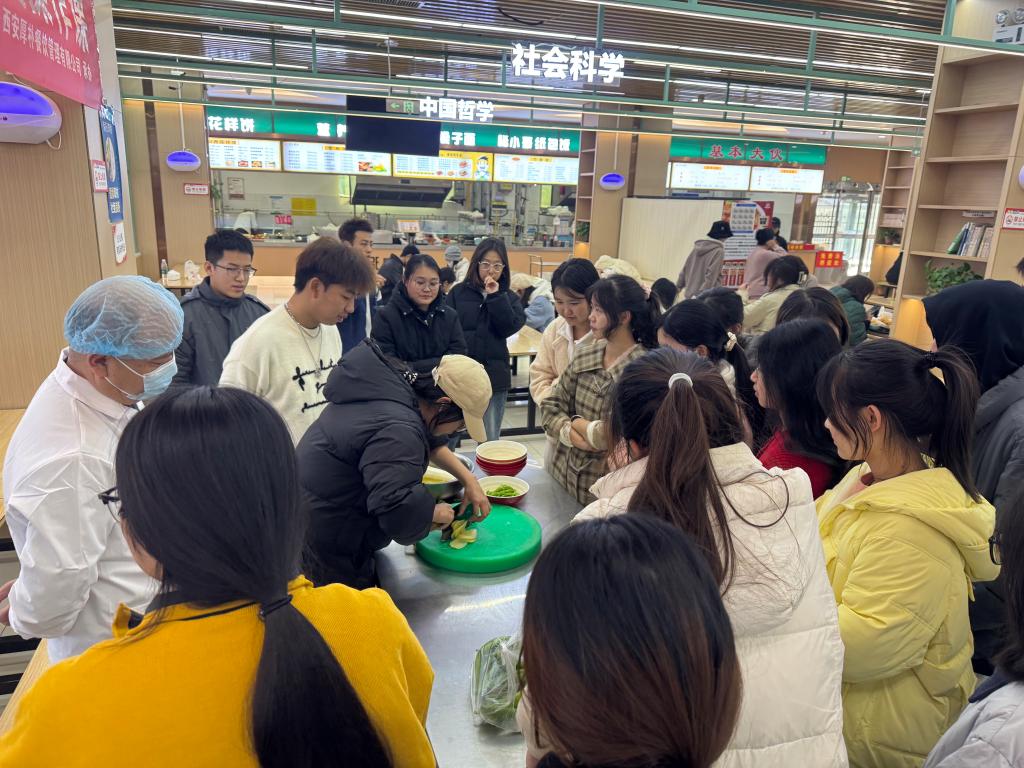 实践教学环节中,学生食堂二餐一层厚朴餐饮公司西点厨师、面点厨师、炒菜厨师分别示范了西点烘焙、面点制作、小吃制作和炒菜制作的详细过程,手把手教同学们学习烹饪技法。
