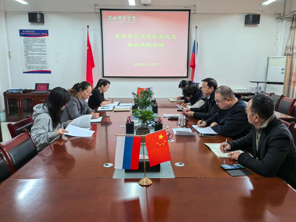 12月19日,莫斯科艺术学院党总支开展廉政提醒谈话,学院全体处科级干部参加,会议由学院党总支书记孟波主持。
