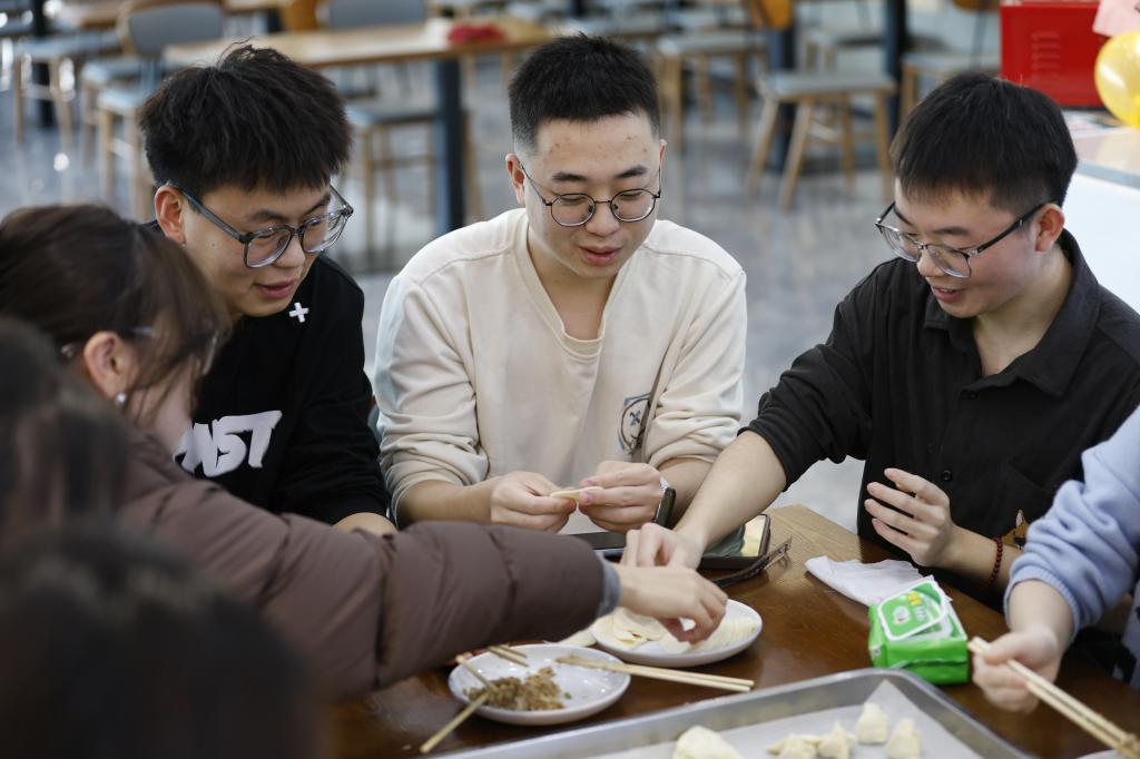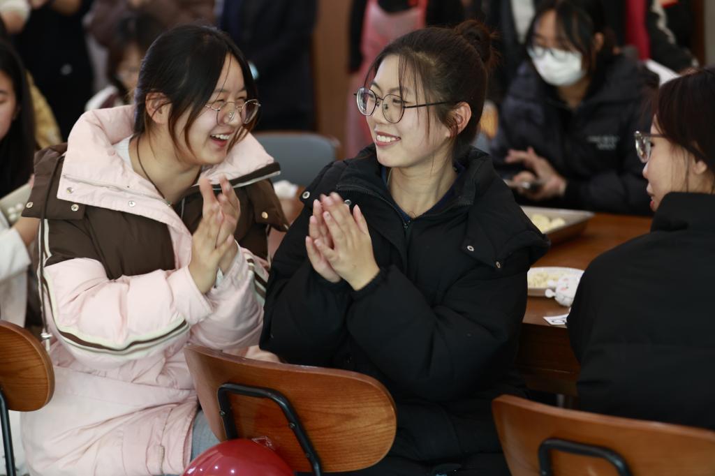 活动开始前,师生于签到处领取饺子吉祥物并书写祝福,情谊满溢。随后,包饺子环节正式开始,师生们热情高涨,纷纷大显身手,现场气氛温馨而欢乐。与此同时,别出心裁的30秒钟“饺”运会、“壶纳冬福”投壶游戏、“筷”乐乒乓大挪移等团队竞赛以及“零零七”“眼疾手快”个人挑战赛也如火如荼地展开。最后,众人围坐共品饺子,在温馨氛围里交流互动,拉近彼此距离。