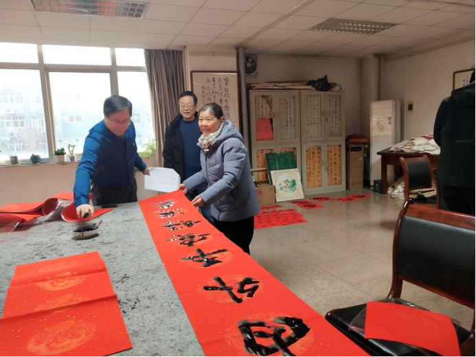 在活动现场,每个人脸上都荡漾着灿烂的笑容。工作人员把笔墨纸砚摆放到每张桌子,取纸的取纸、抻纸的抻纸、晒联的晒联……陆陆续续领春联的职工也加入了工作人员中间。