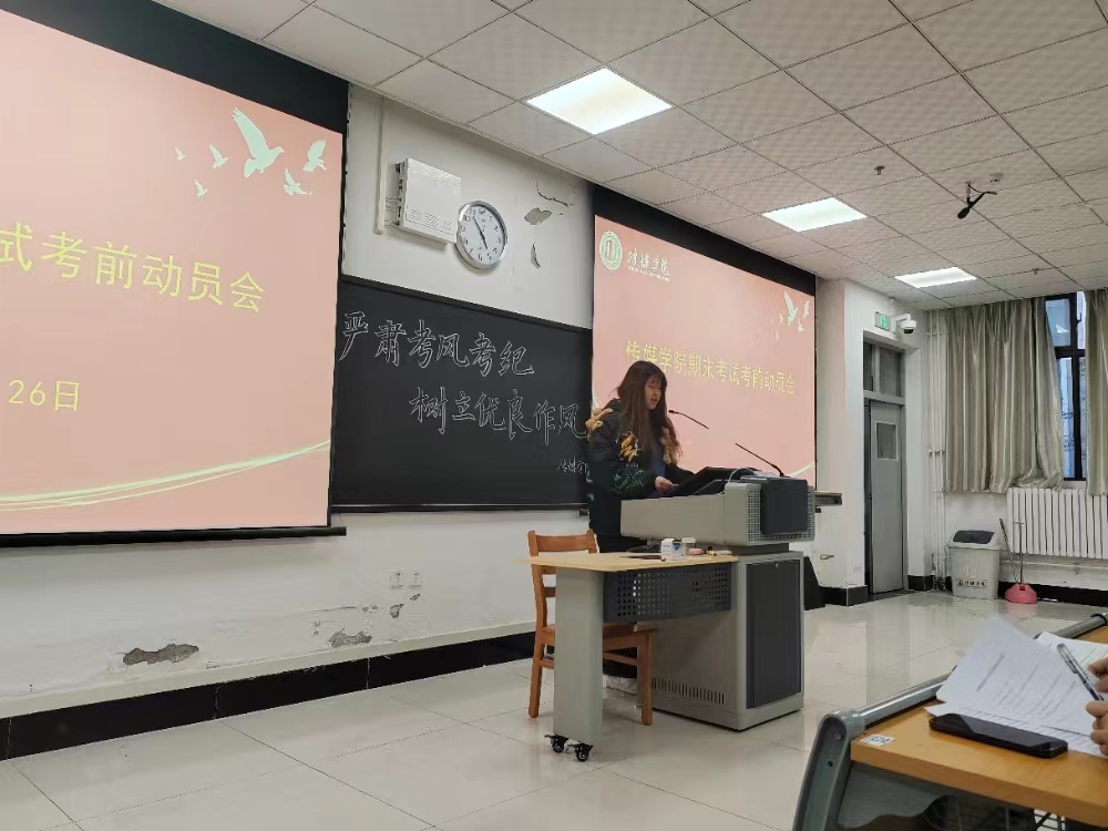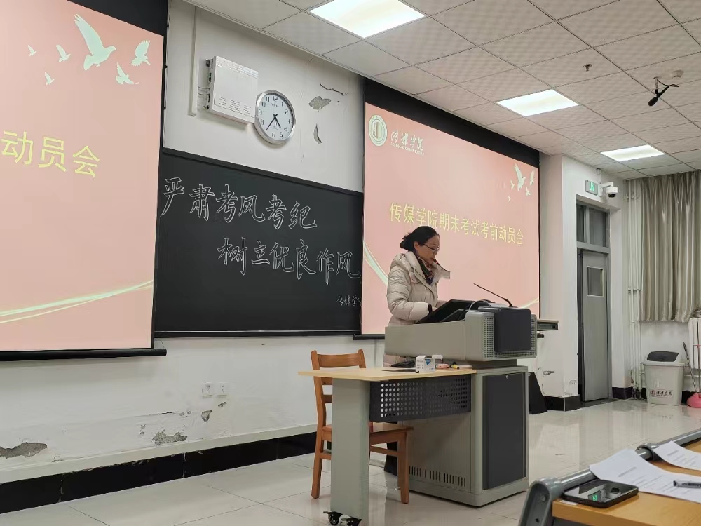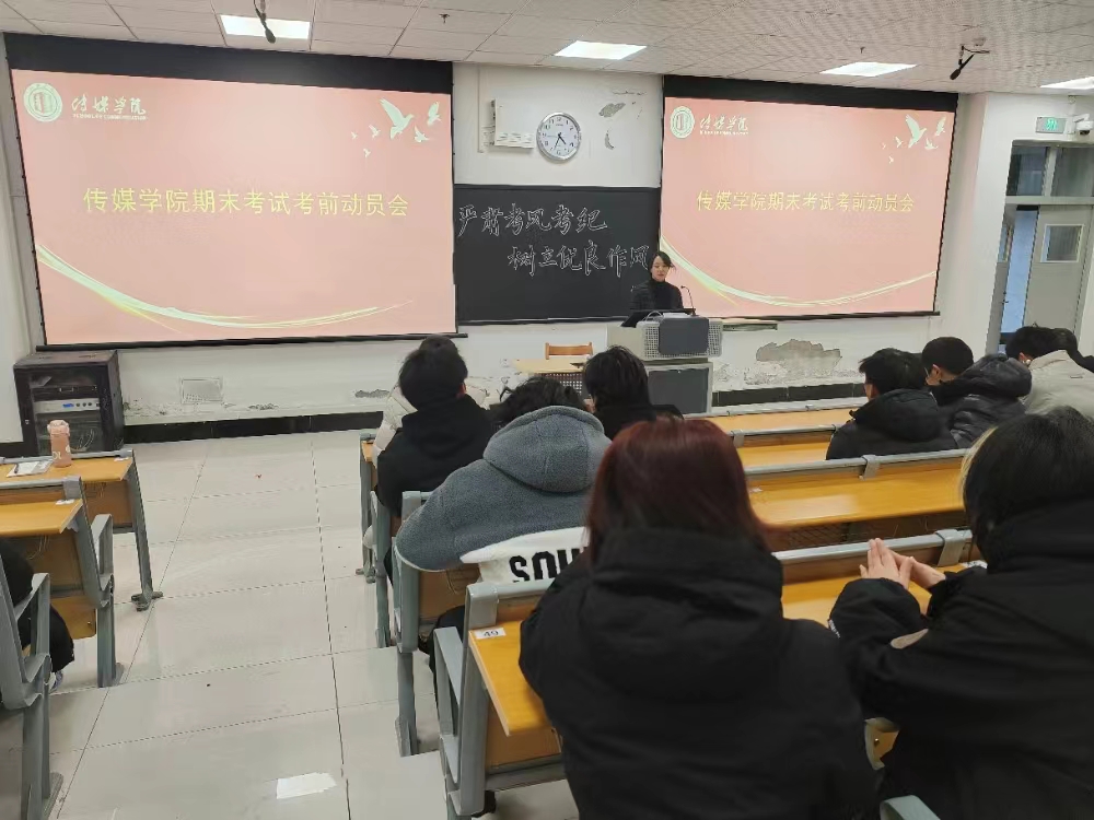 12月26日,传媒学院在138教室召开期末考试考前动员会。院长曹熙斌、副院长侯君奕、2024级新生200余人参会。会议由党总支副书记周双主持。